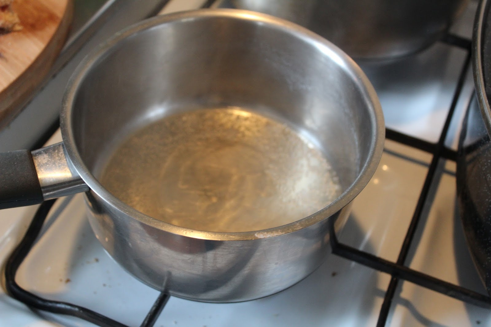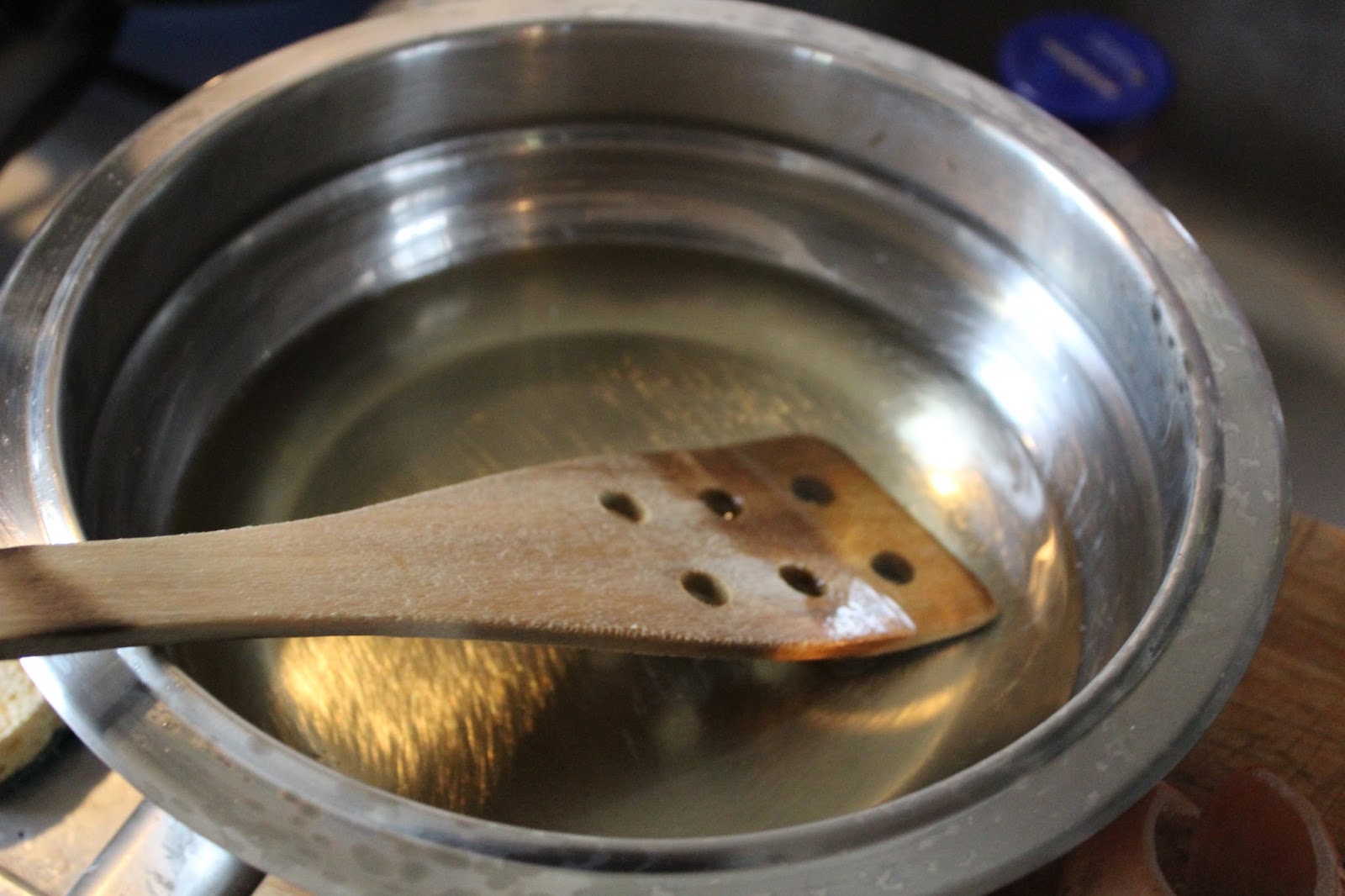 Das Stück Kokosfett schmelze ich über dem Wasserbad. Wer sowas nicht ausgewiesenermaßen als Wasserbad im Küchenuntensilfundus hat, kann auch einen kleineren Topf in einen größeren mit Wasser gefüllten Topf stellen