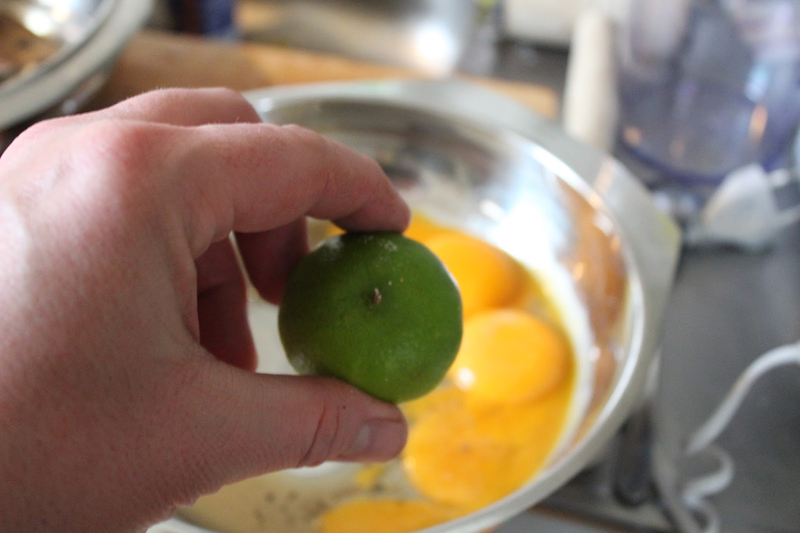 Den Saft einer halben Limette zum Eigelb und der Reduktion geben. Die Zutaten über dem Wasserbad mit dem Zauberstab miteinander vermischen, bis sie leicht anziehen, sprich sich miteinander verbinden.