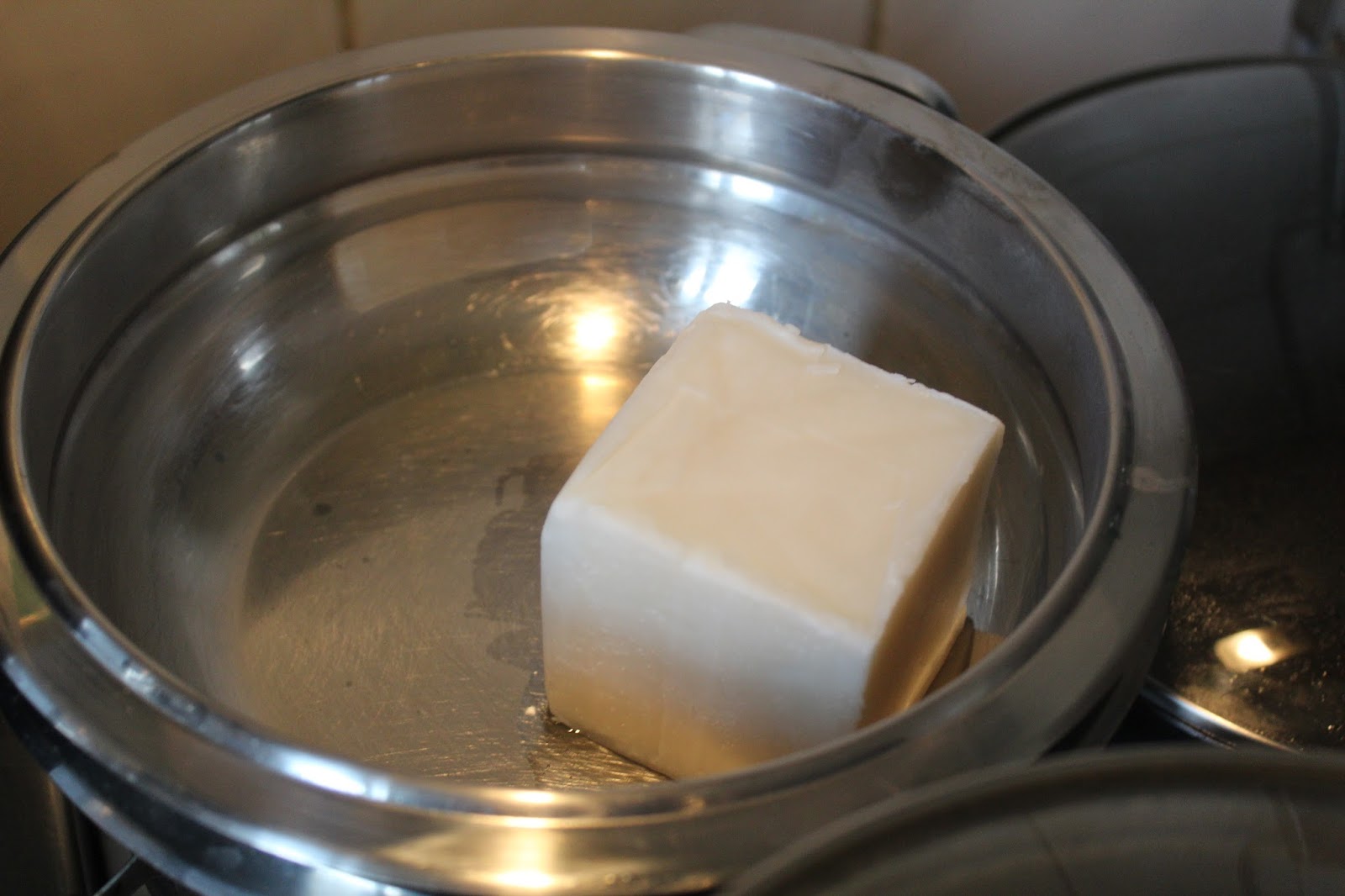 Das Kokosfett schmilzt über dem Wasserbad, danach stelle ich die Schüssel zur Seite und das Fett soll beim Emulgieren, später ungefähr 50 Grad Grundtemperatur haben.
