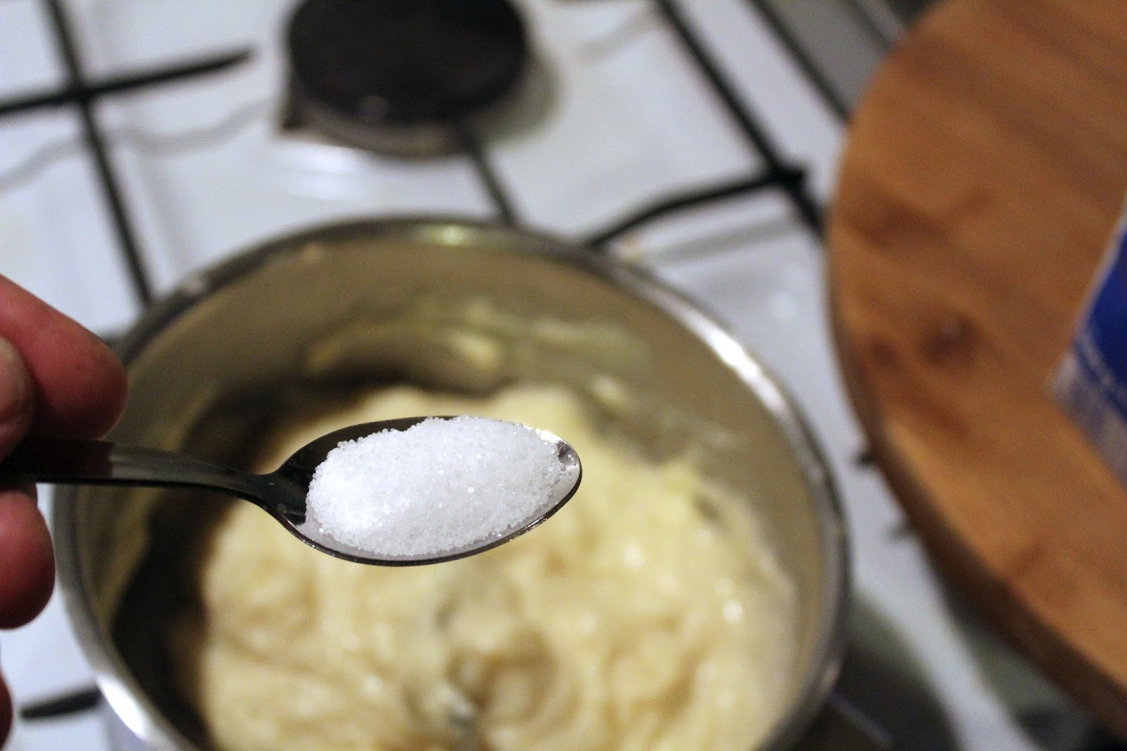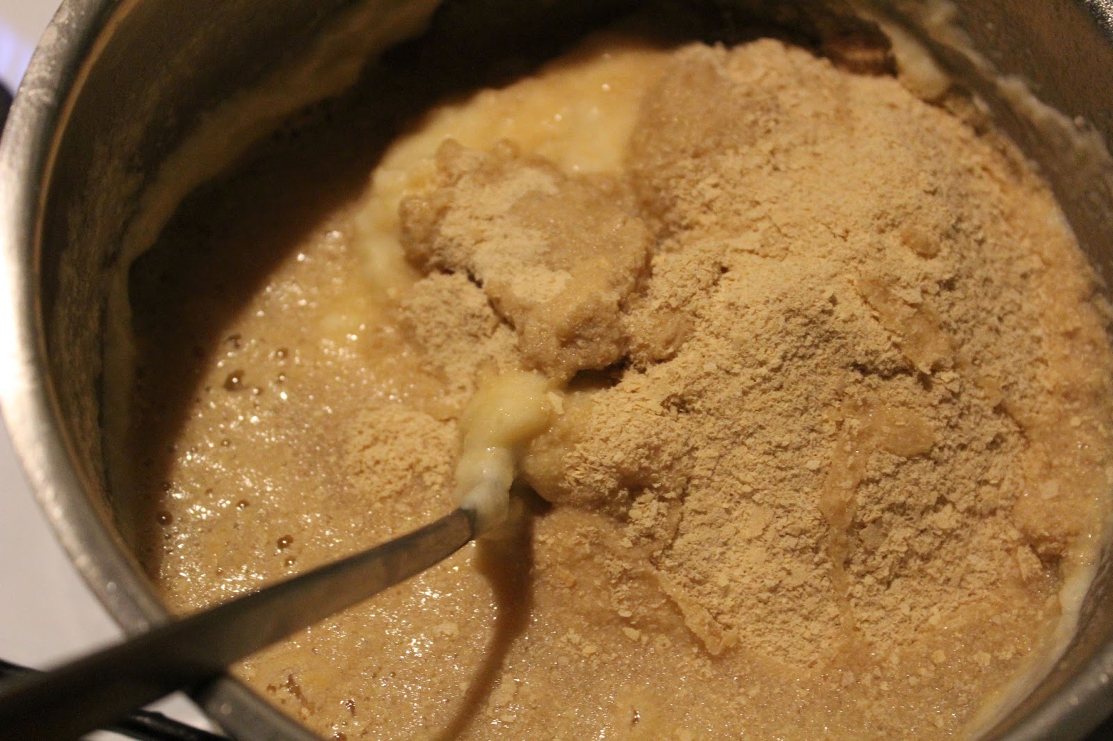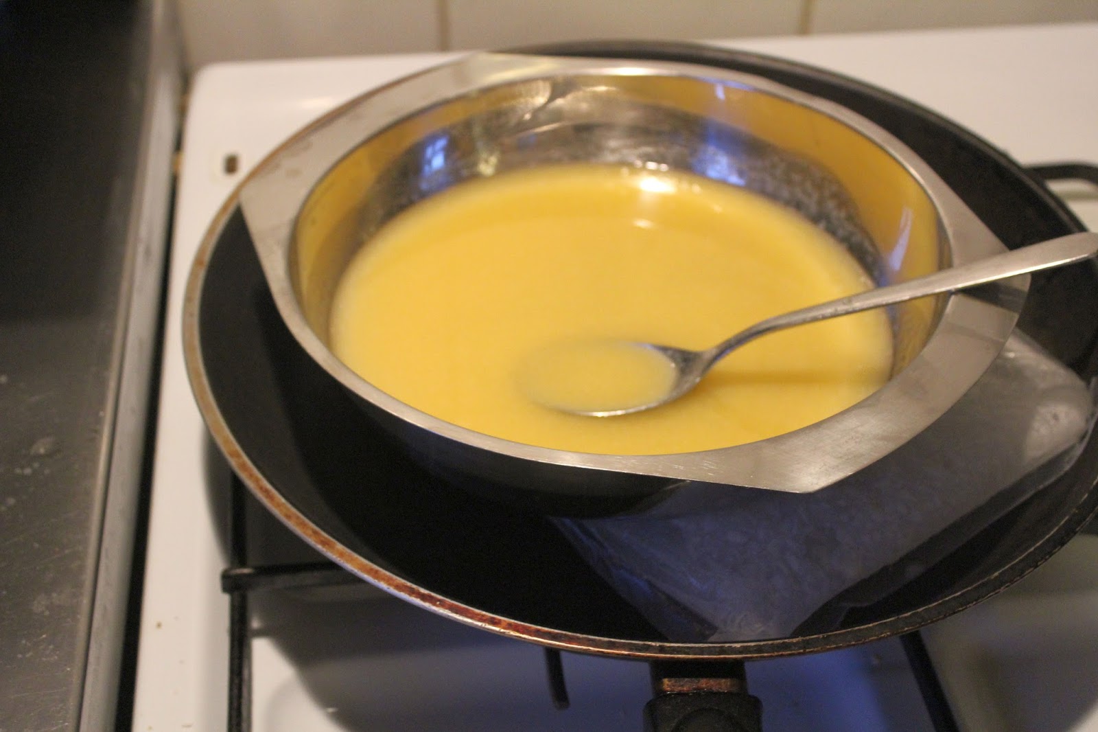 Nun kann man schon sehen, wie die Masse fester und deutlich gelber wird.