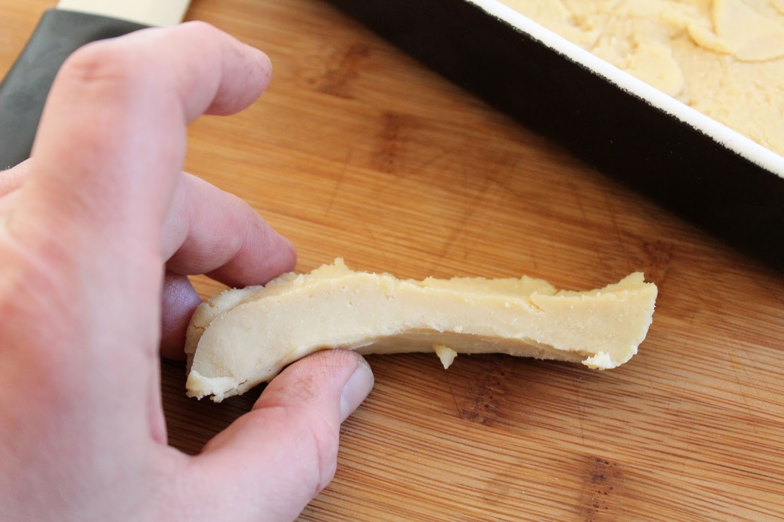 Geschmackstest: Schmeckt gut, die Konsistenz ist angenehm, wie fester Schmelzkäse und schmeckt auch ein bisschen käsig, ohne irgendeine Richtung zu haben, wie Gouda, Leerdamer, Edamer, oder so. Das kommt aber von den Hefeflocken, die meiner Ansicht nichts für Feinschmecker sind, weil sie alles gleich schmecken lassen. Das ist quasi sowas wie Fondor für Andersdenkende und ich werde noch versuchen die Flocken durch Natron zu ersetzen.