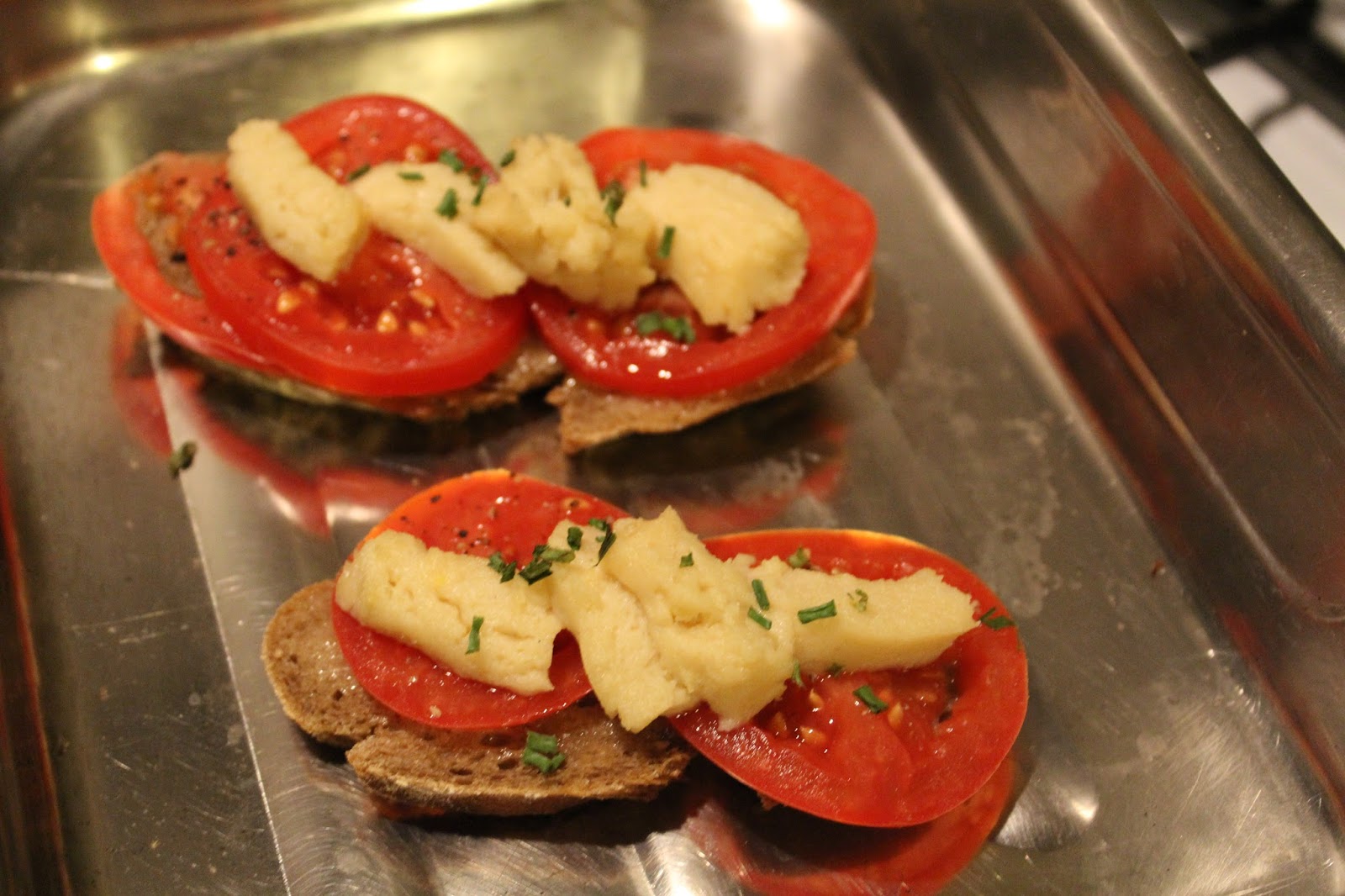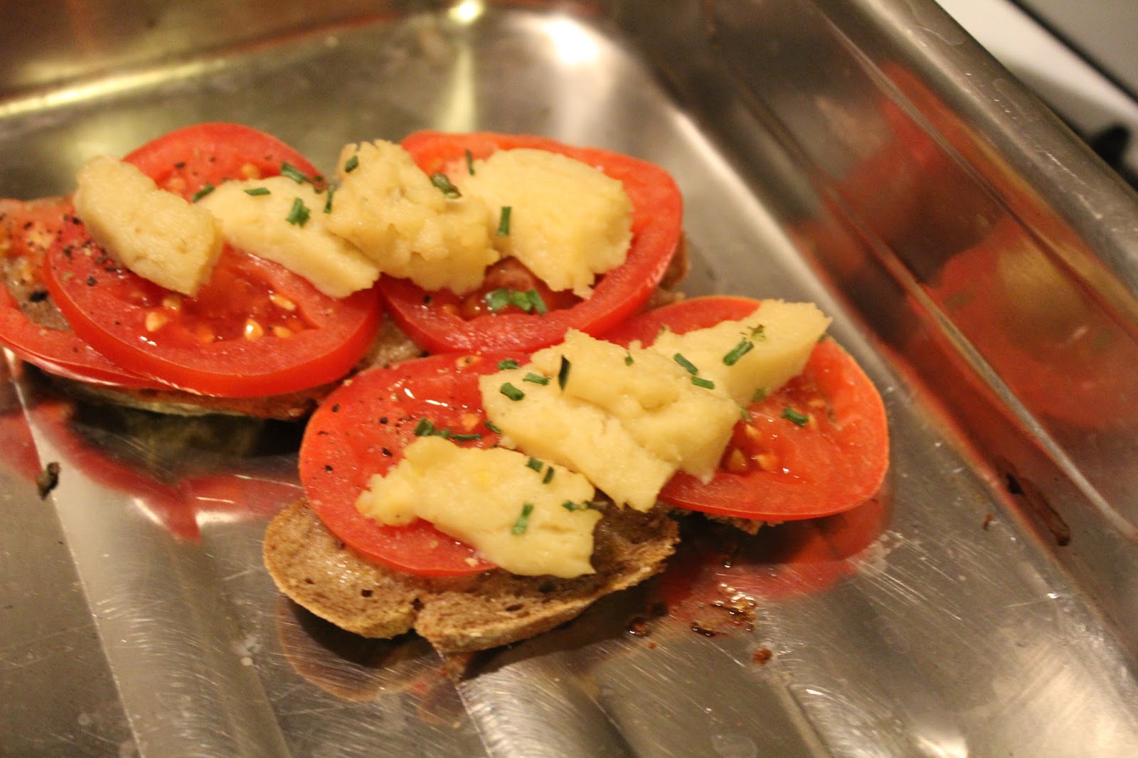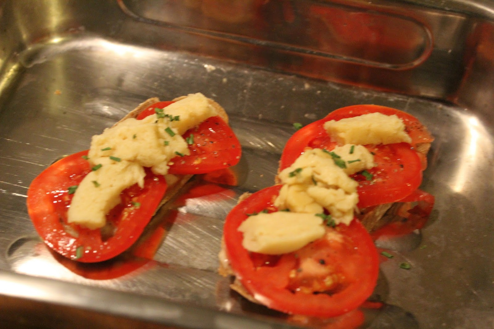 Erst dachte ich mir, so’n schönes Stück Fleisch zum Überbacken wäre gut, aber wieso sollte ich dafür so nen Käseersatz nehmen? Also habe ich mich auf den kleinsten gemeinsamen Nenner geeinigt und eine Tomate genommen