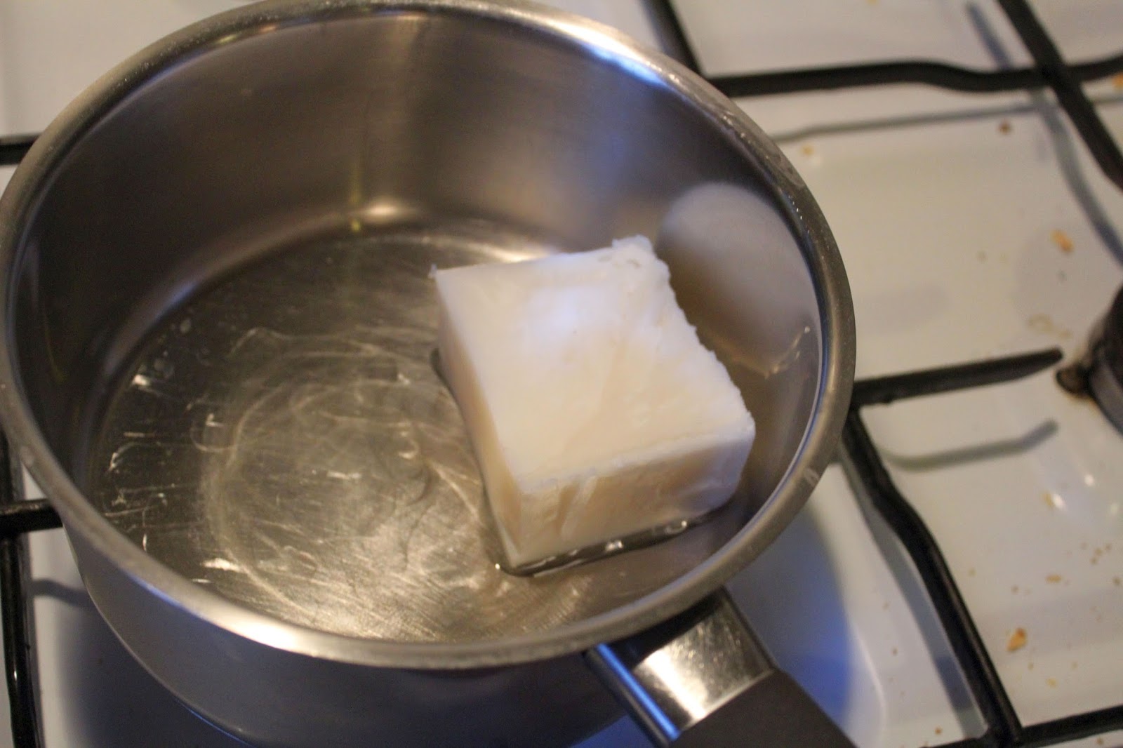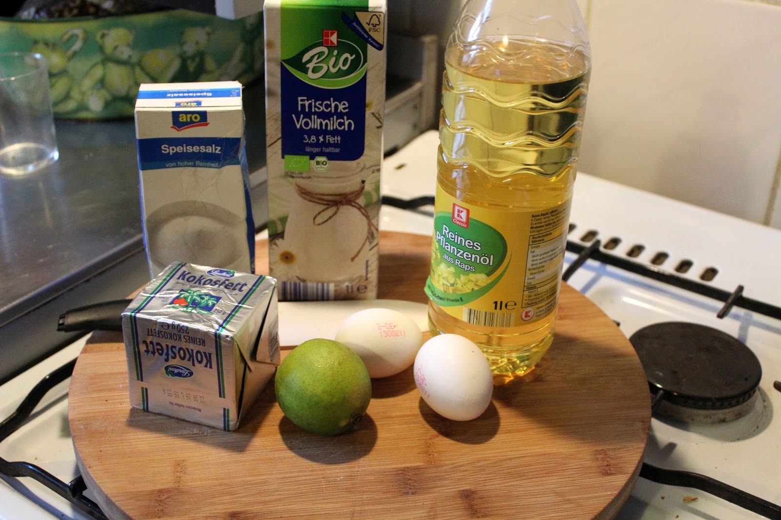 Kokosfett im Topf schmelzen. Kann man auf der niedrigsten Stufe machen, dann muss man es später beim Kaltrühren nicht wieder so weit runterkühlen.