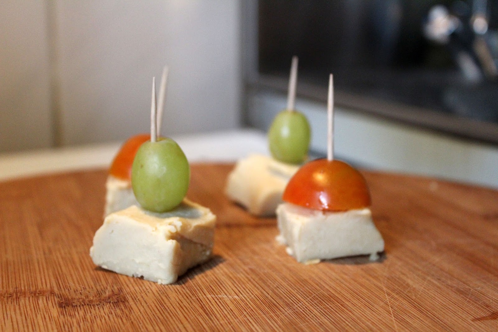 Man gewöhnt sich jedenfalls schnell an den Geschmack und irgendwann glaubt man tatsächlich sowas wie Käsegeschmack zu schmecken. Ich habe deswegen noch den Geschmackstest als klassischer Partyhappen mit Tomate und Weintraube gemacht.
