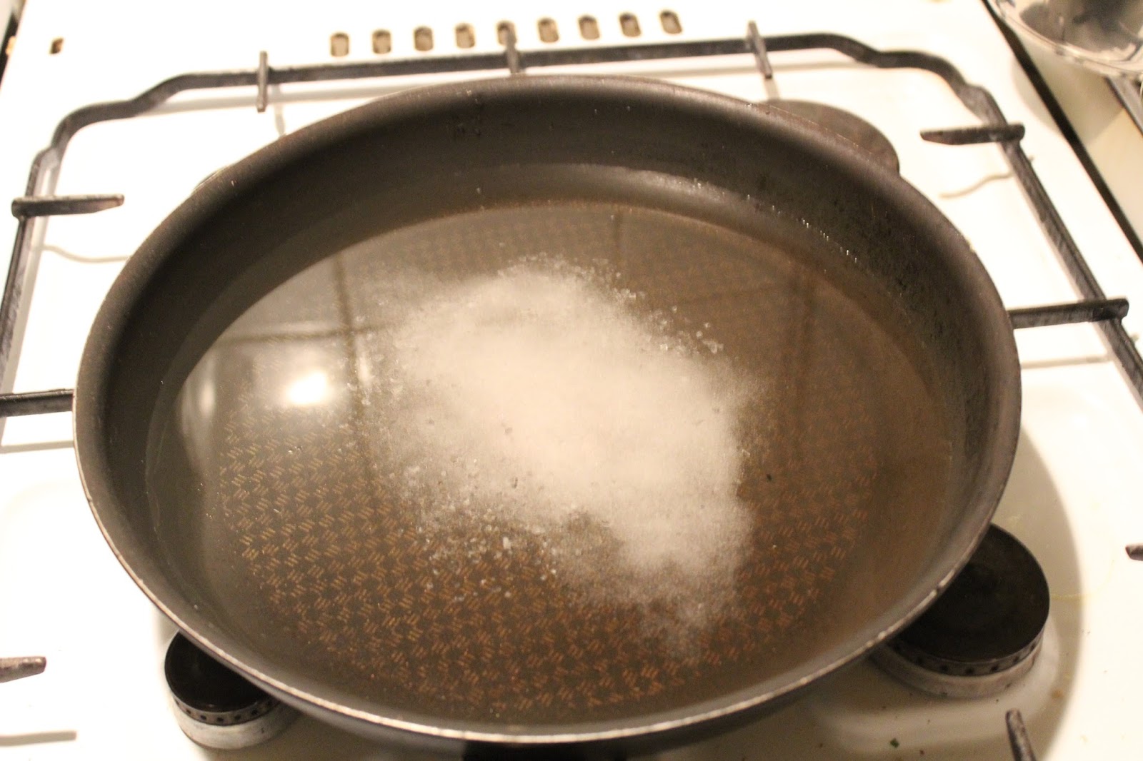 Ich habe das Rezept nur für zwei Personen mit einem Pfund Spargel gemacht, dann nehme ich auch mal meine Pfanne mit Deckel. Beim Spargelwasser richtig mit Zucker und Salz rumsauen und vor allem nehme ich mehr Zucker als Salz
