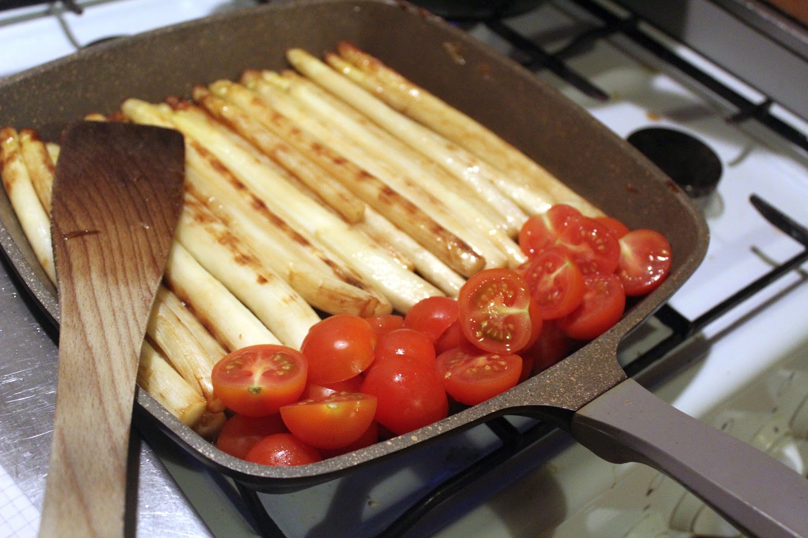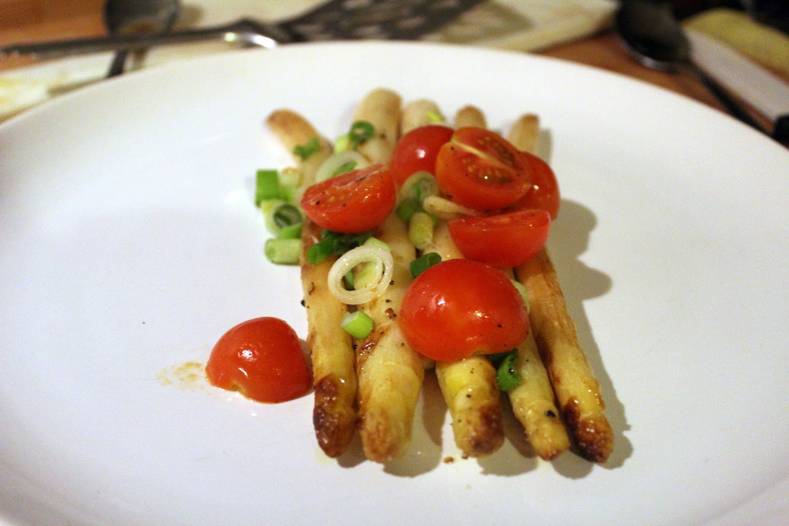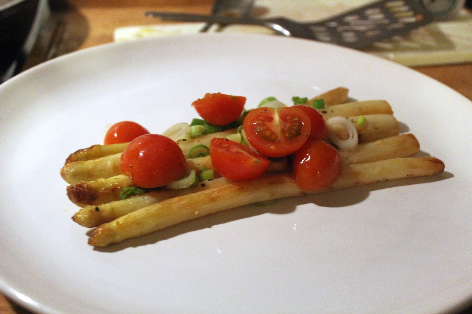 Ich den letzten zwei Minuten Garzeit kommen halbierte Tomaten (irgendeine kleine Sorte, wie Cherrytomaten) in die Pfanne. Wenn der Herd am Ende ausgeschaltet ist, noch die zerkleinerten Lauchzwiebeln in die Pfanne geben. JETZT vor dem Servieren wird der Spargel gewürzt mit Salz, Pfeffer und Zucker. Wer mag kann auch noch Limette, oder Zitrone darüber geben.