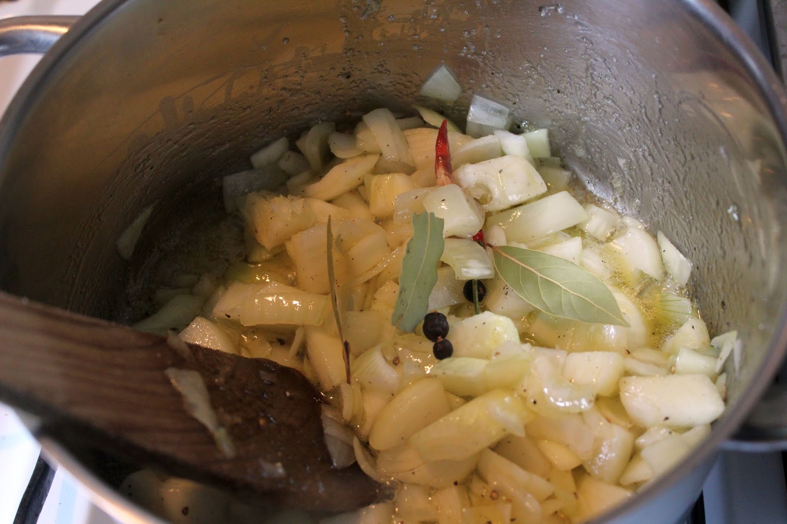 Wacholderbeeren, Lorbeerblätter dazu werfen.