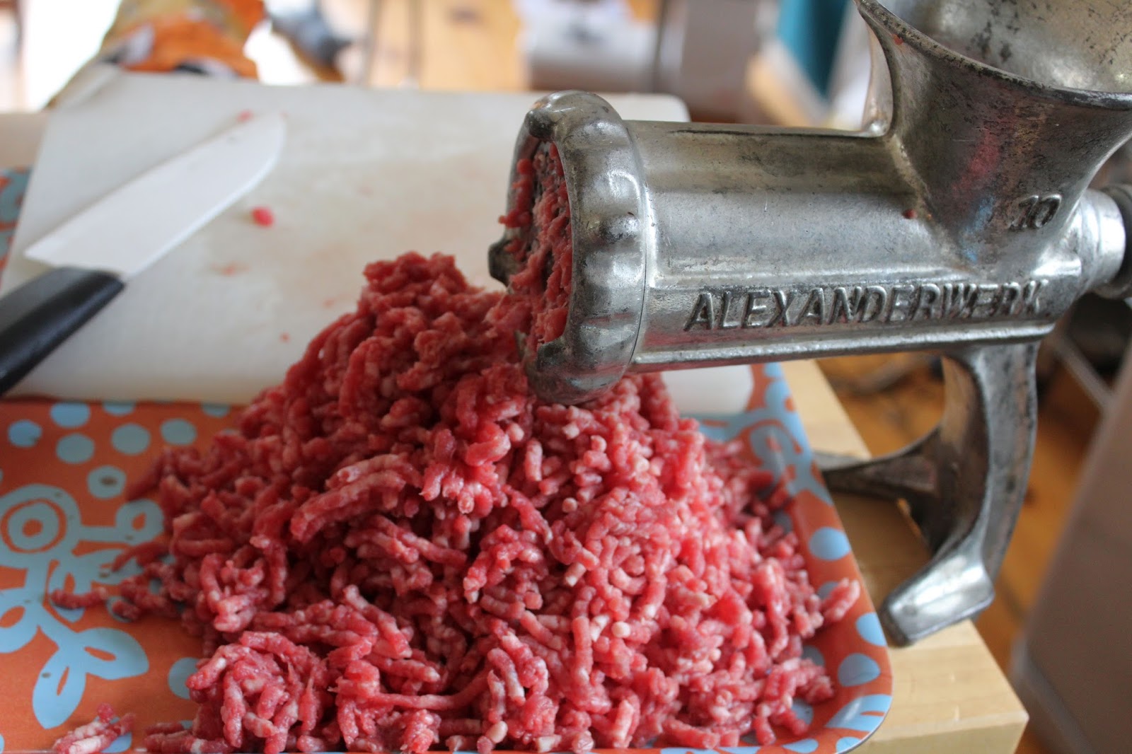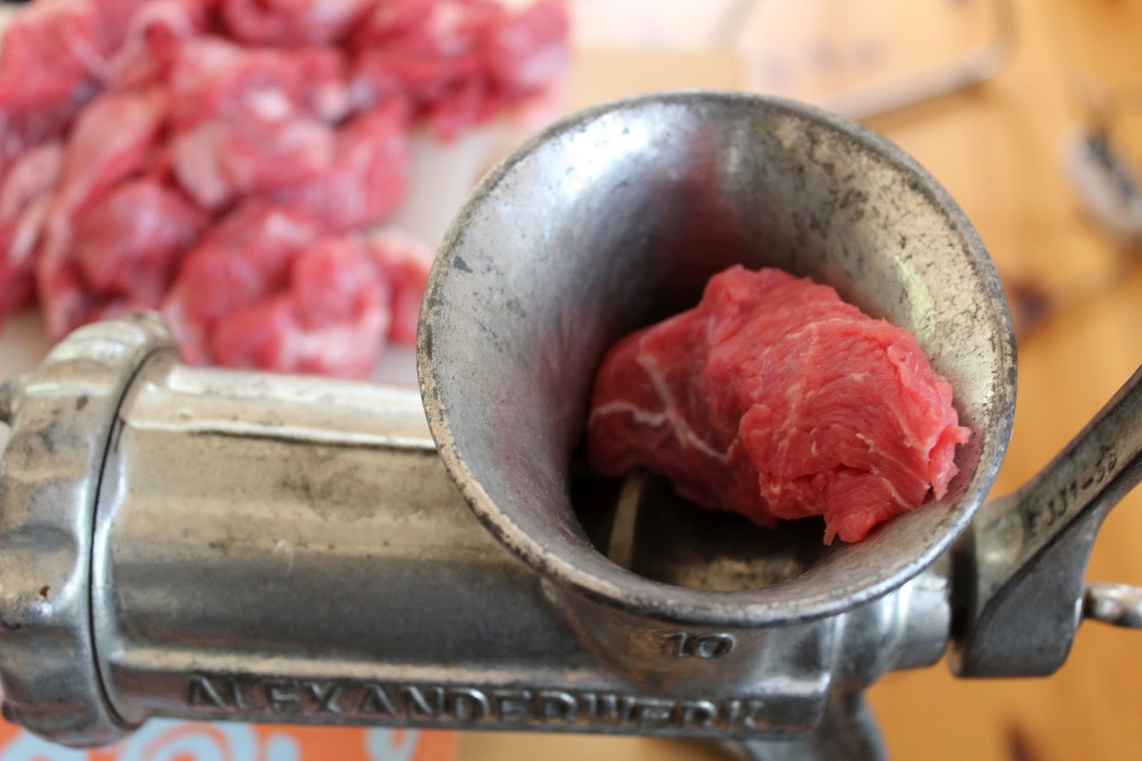 Natürlich kann man auch fertig gekauftes Hackfleisch kaufen gehen, aber das ist nicht mein Anspruch. Deswegen nehme ich günstiges Rindersuppenfleisch und wolfe es selbst zu Rinderhack. In den Supermarkt zu gehen kennt Ihr alle, dafür braucht Ihr nicht meinen Blog zu lesen. Deswegen möchte ich Reklame für das selbst Wolfen machen, weil man da eben das Stück Fleisch vorher sieht und weiß, dass es nur von einem einzigen Tier ist. Mir gefällt der Gedanke nicht, dass man bei gekauftem Hack bei Rind bis zu 60 Tiere in einer 500 Gramm Packung Hack hat. Fragt mich nicht warum, aber seit ich das weiß, verwende ich das nicht mehr bei mir zuhause.
