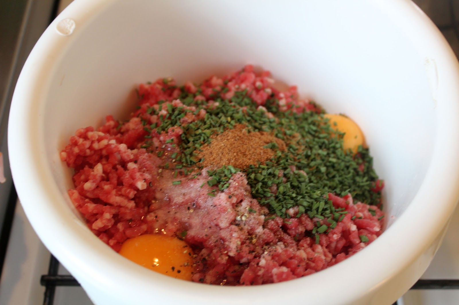 Das Rinderhack in eine Schüssel geben, zwei Eier in der Schüssel aufschlagen.