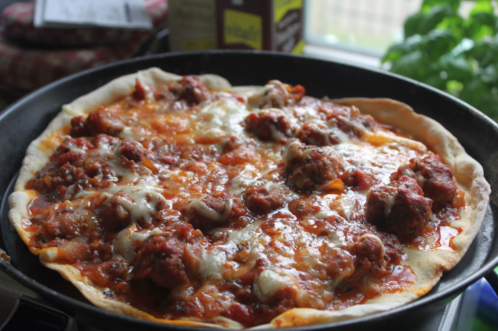 Nach zwölf Minuten Volldampf und nur Unterhitze im Ofen ist die Pizza genau richtig. Der Käse ist geschmolzen, der Boden unten knackig und die Hackfleischbälle sind innen gut durchgewärmt.