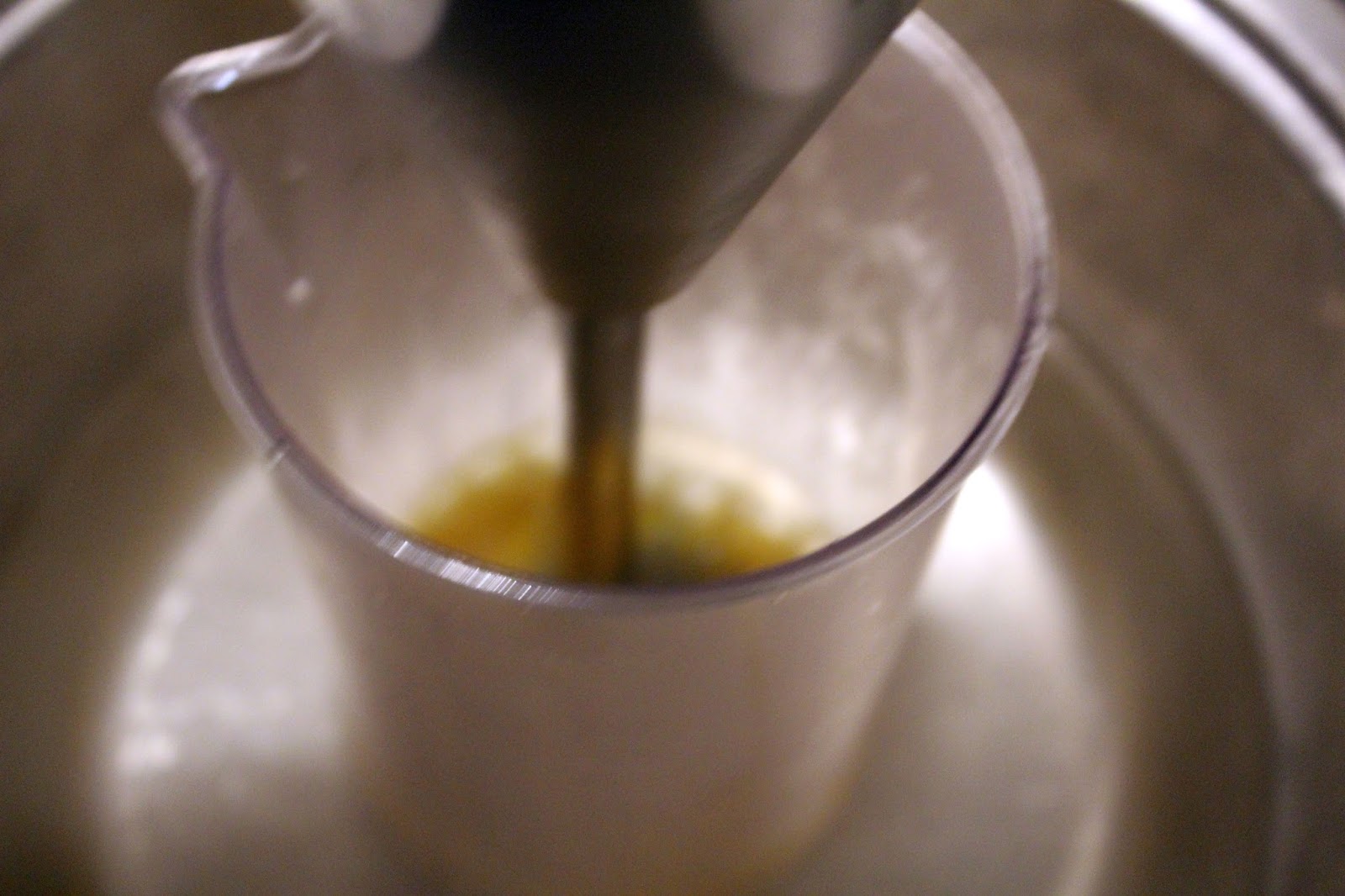Das Wasser über dem vorher die Schale mit der Butter stand, habe ich jetzt auf kleinste Stufe angestellt, da kommt nur das Litermaß hinein und ich benutze meinen Zauberstab von Esge um das Ei mit 19000 Umdrehungen aufzuschlagen. Die Reduktion kippe ich noch langsam dazu. Danach kurz probieren und nachsalzen. Mir war die Säure der Limette ein bisschen zu heftig, deswegen habe ich noch ein wenig Zucker dazu gegeben.