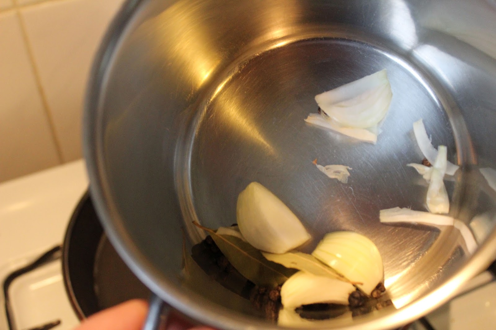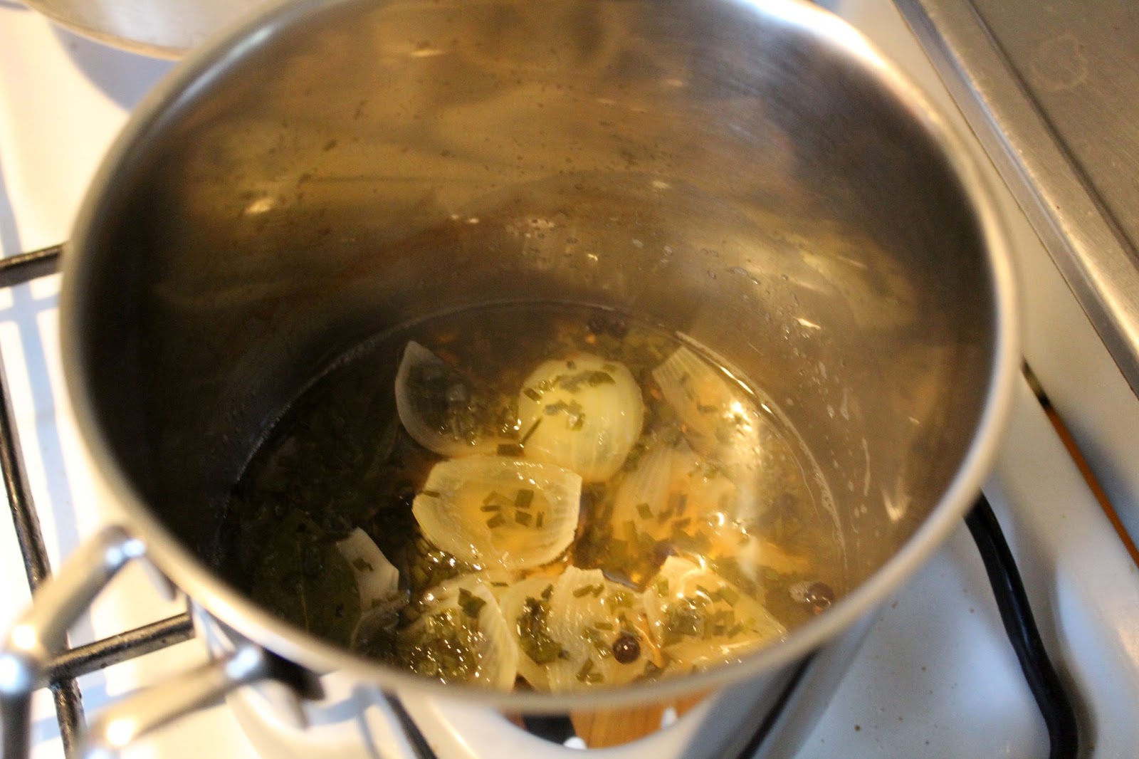 In die Reduktion kommen hinein, eine Zwiebel, oder noch besser eine Schalotte, zwei Lorbeerblätter, 2 Wacholderbeeren, 10 Pfefferkörner, Salz (erstmal vorsichtig), sowie 250 Milliliter Weißwein (trocken)