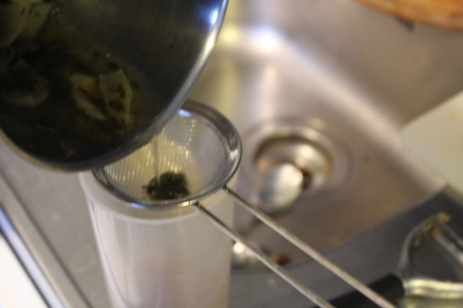 Die Feststoffe verbleiben im Sieb und die Reduktion landet im Behälter. Das kann auch ein Glas oder sonstwas zum Auffangen sein.