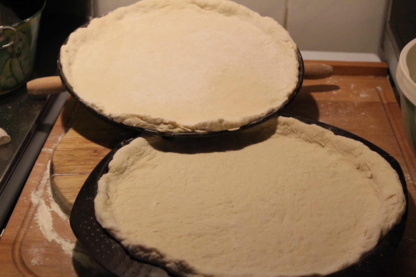 Danach den Teig halbieren und jeweils die halbe Teigmenge auf einem runden Brett in Größe der Pizzableche ausrollen. Vorausgesetzt Ihr backt das auf runden und nicht auf viereckigen Blechen.