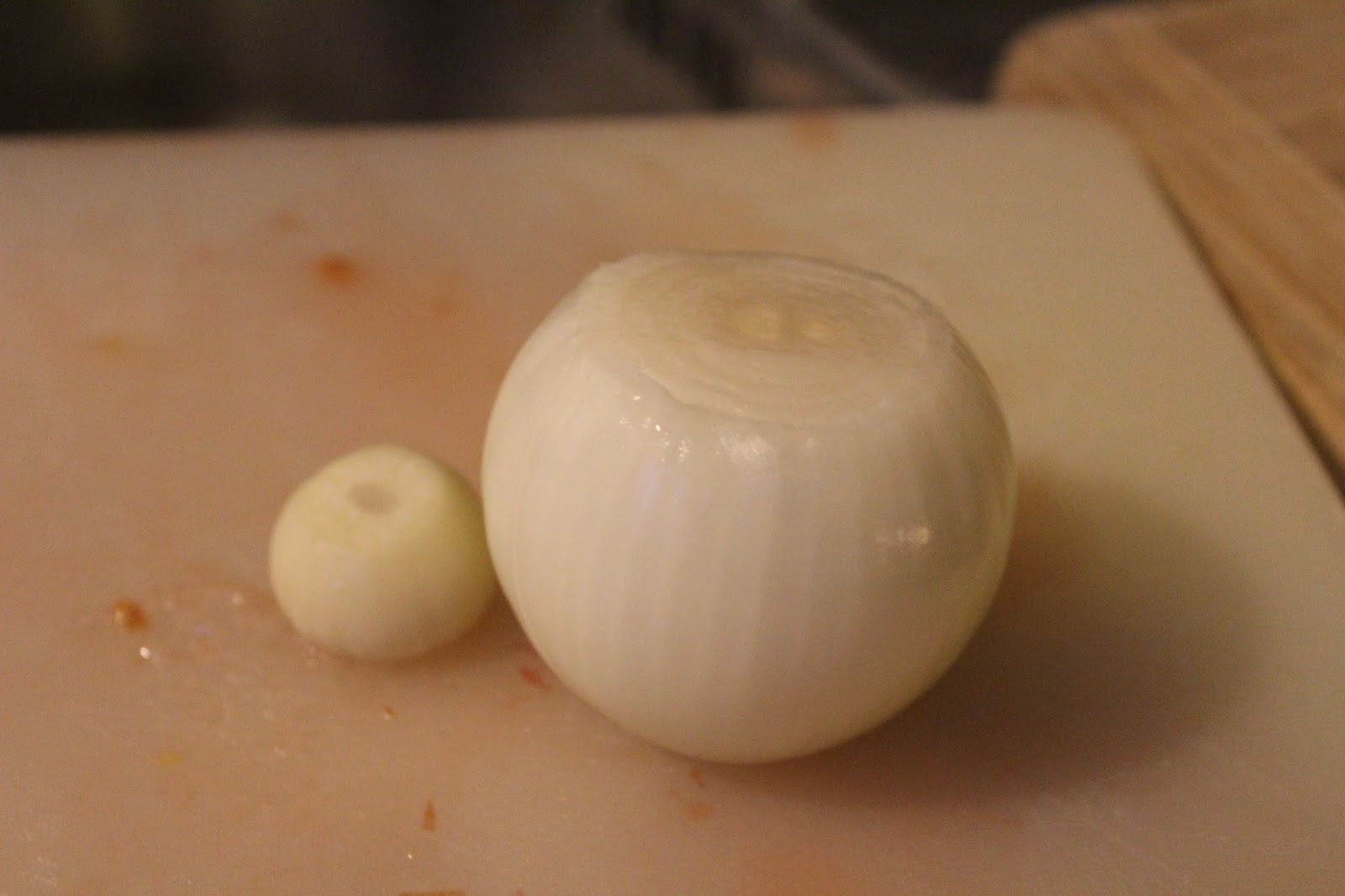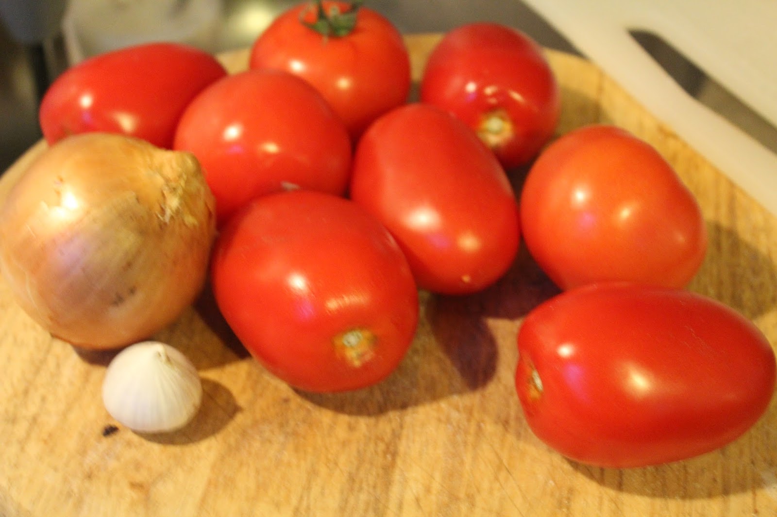 Tomaten, ein Teelöffel Salz, Zwiebeln, Knoblauch
