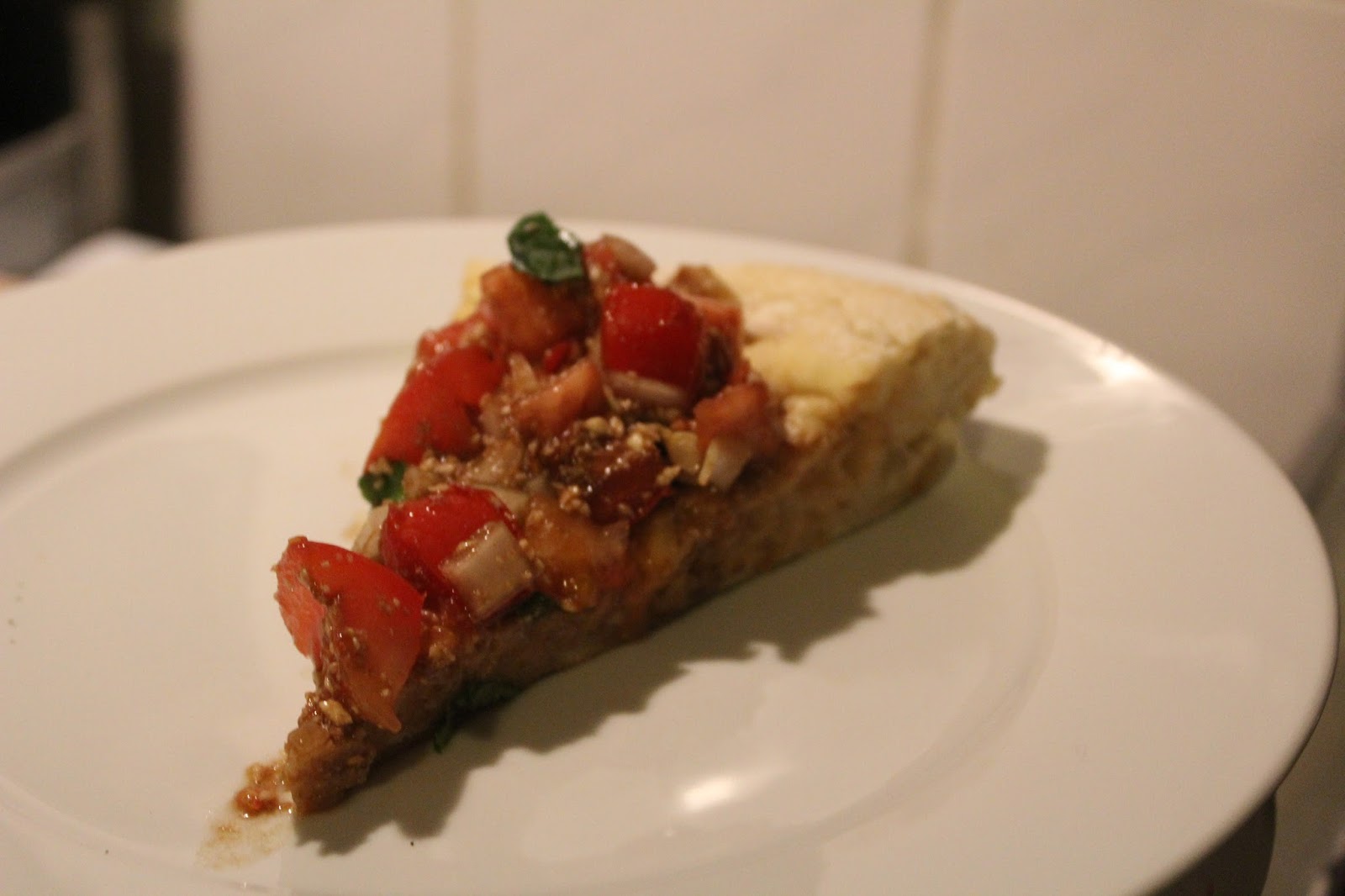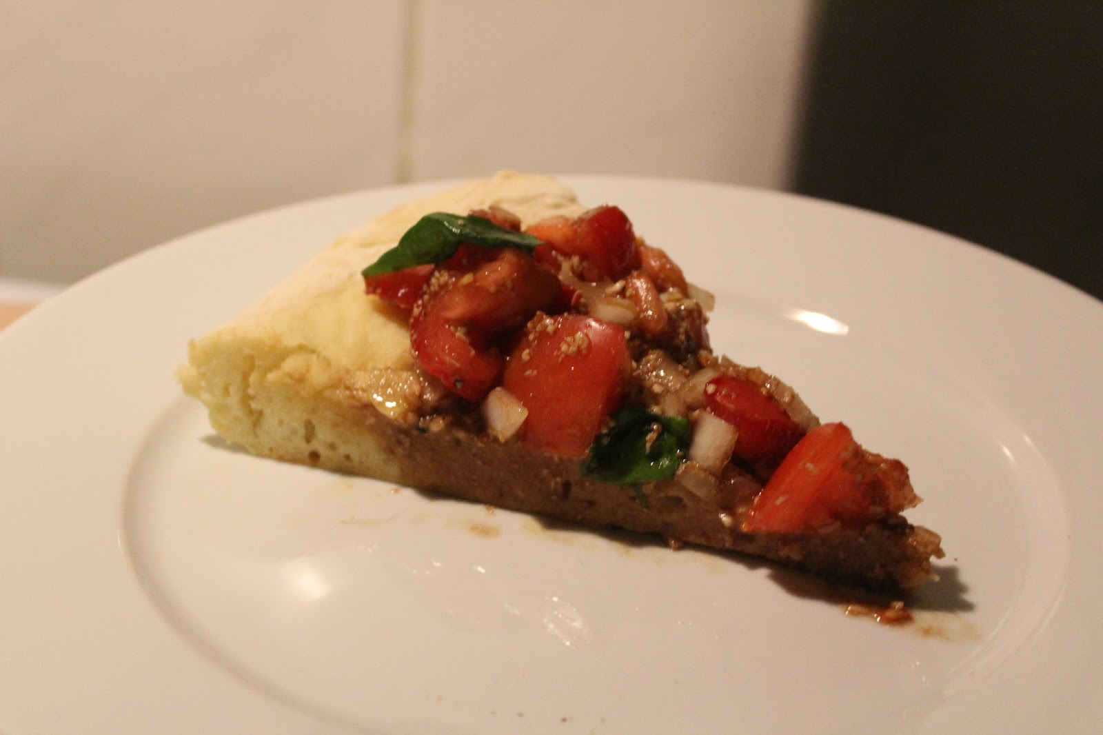 Das ist total lecker und schmeckt am besten frisch aus dem Ofen kommend. Dann ist der Teig noch schön knusprig und harmoniert toll mit der Bruschettaauflage.