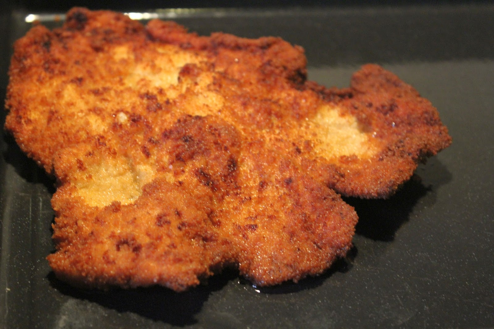 Danach kommt das Schnitzel auf ein Backblech bis alle vier Schnitzel, die das Kilo hergibt gebraten sind.