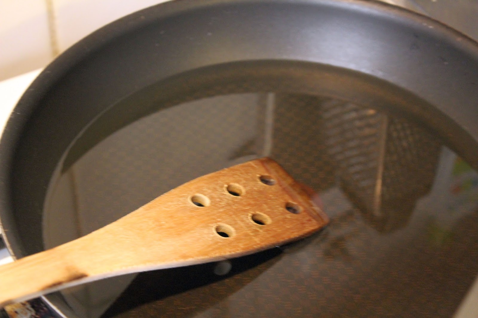 0,5 Liter Pflanzenöl in der Pfanne erhitzen, bis am Pfannenwender Blasen aufsteigen.