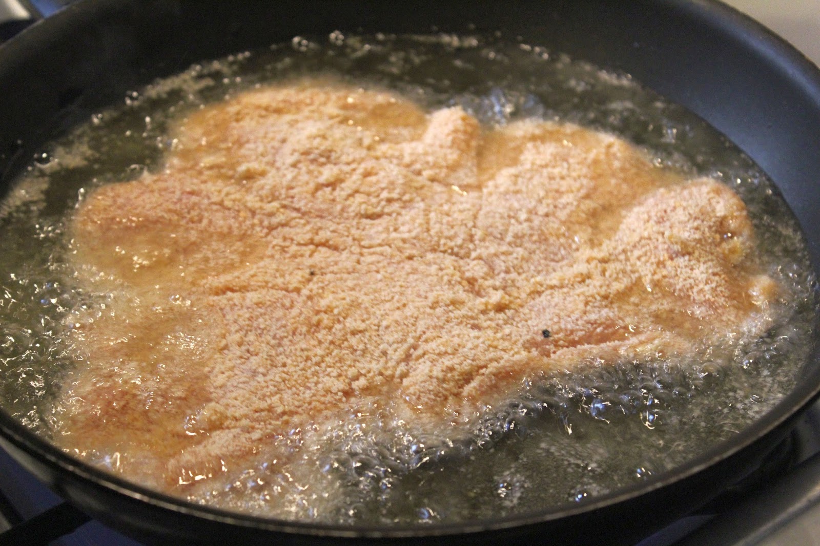 Dann ist die Temperatur gut und ich drehe den Gasherd auf halbe Kraft zurückt. Bei dem dünnen Fleisch brauche ich nur 2 Minuten pro Seite. Wichtig ist, dass man mit einem Esslöffel das heiße Fett über das Schnitzel löffelt. So macht man gutes noch besser.