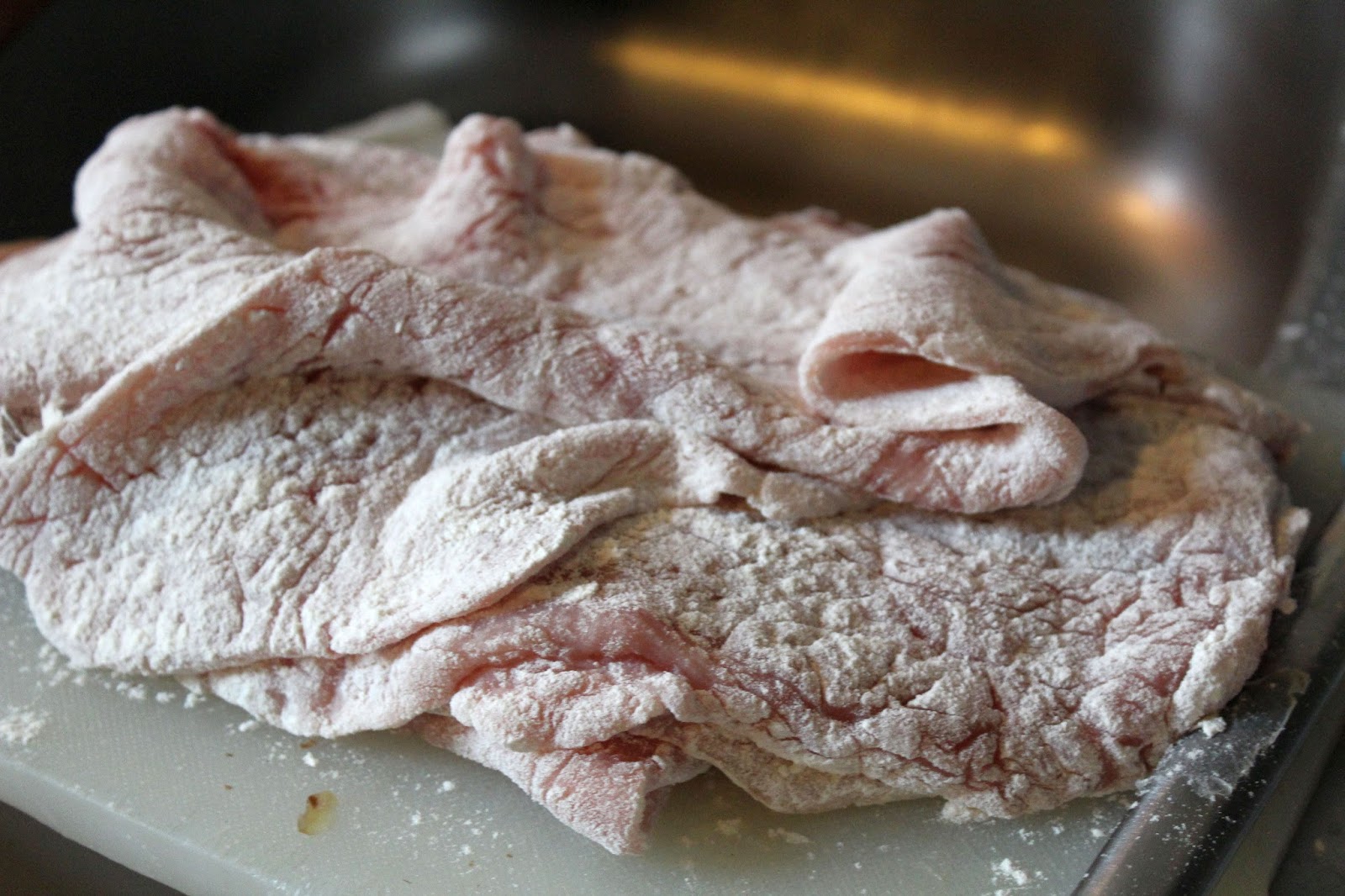 Ich bearbeite das Fleisch ausnahmsweise mal in kompletten Etappen, weil die riesigen Fleischstücke nicht so leicht von der Hand gehen, wie reguläre Schnitzelgrößen.