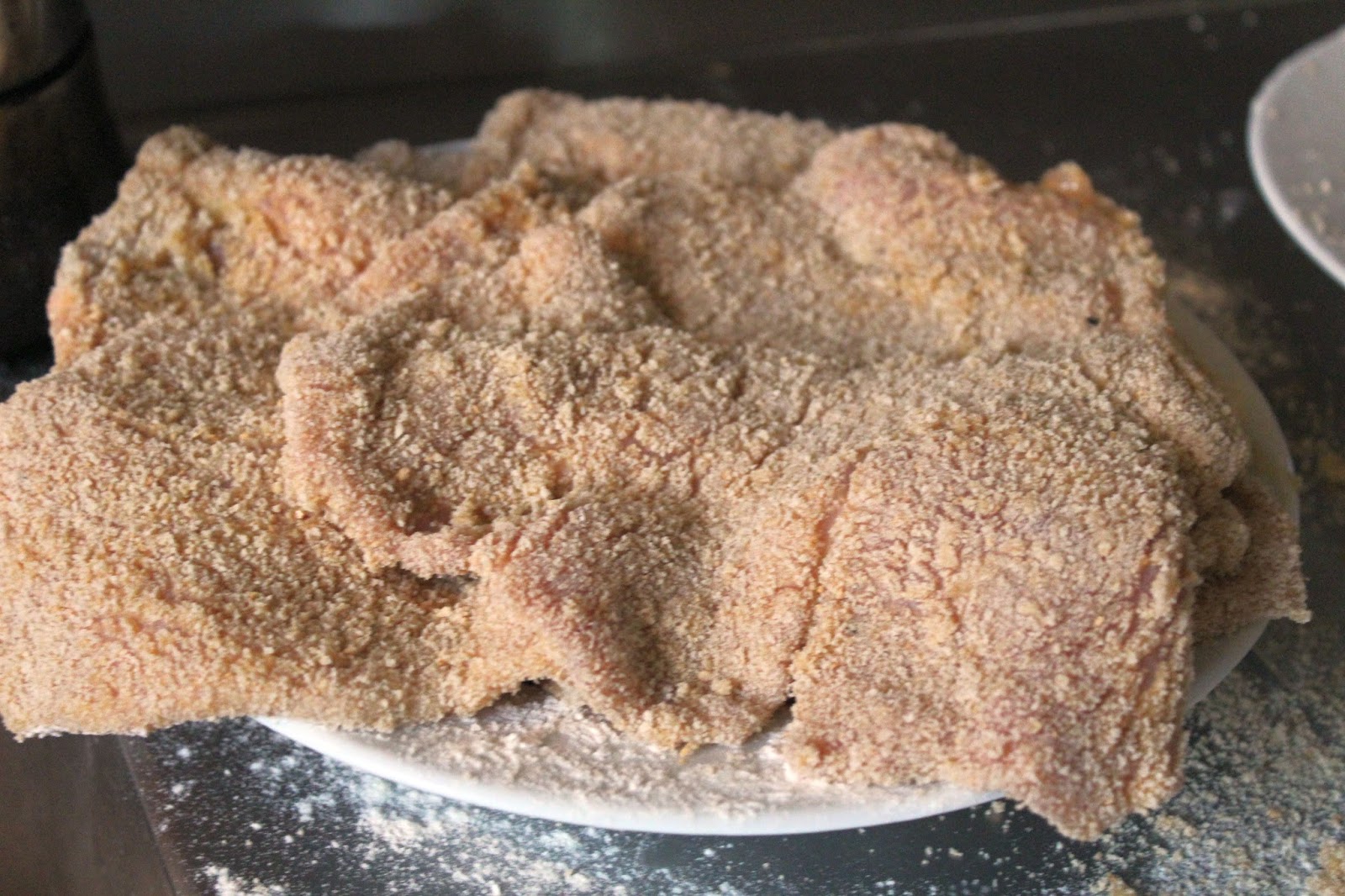 Als letzter Arbeitsgang der Vorbereitung, kommt dann das Paniermehl ans Schnitzel.