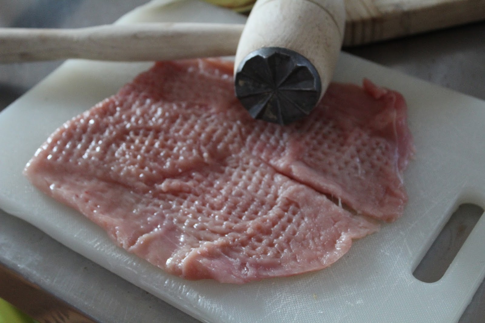 Fleisch mit dem Fleischklopfer bearbeiten. Da ich der langen Fleischfaster nicht so recht über den Weg traue, gibt es das bei dieser Gelegenheit ein bisschen intensiver, als ich das im Normalfall mache.