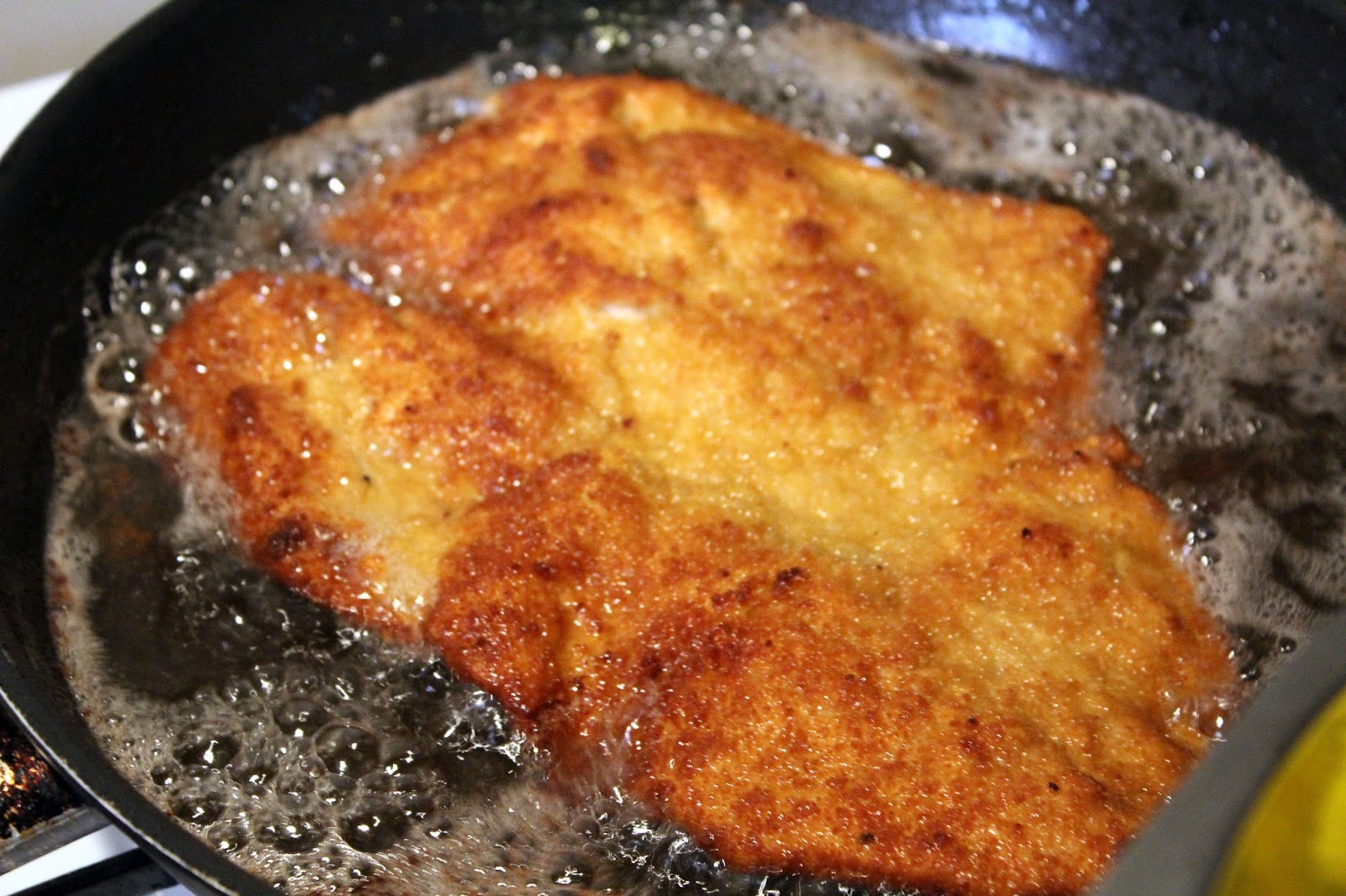 Panieren mit dem drei Teller System, 1 tiefer Teller Mehl, 4 Eier verquirlen, ordentlich mit Salz und Pfeffer würzen und Paniermehl