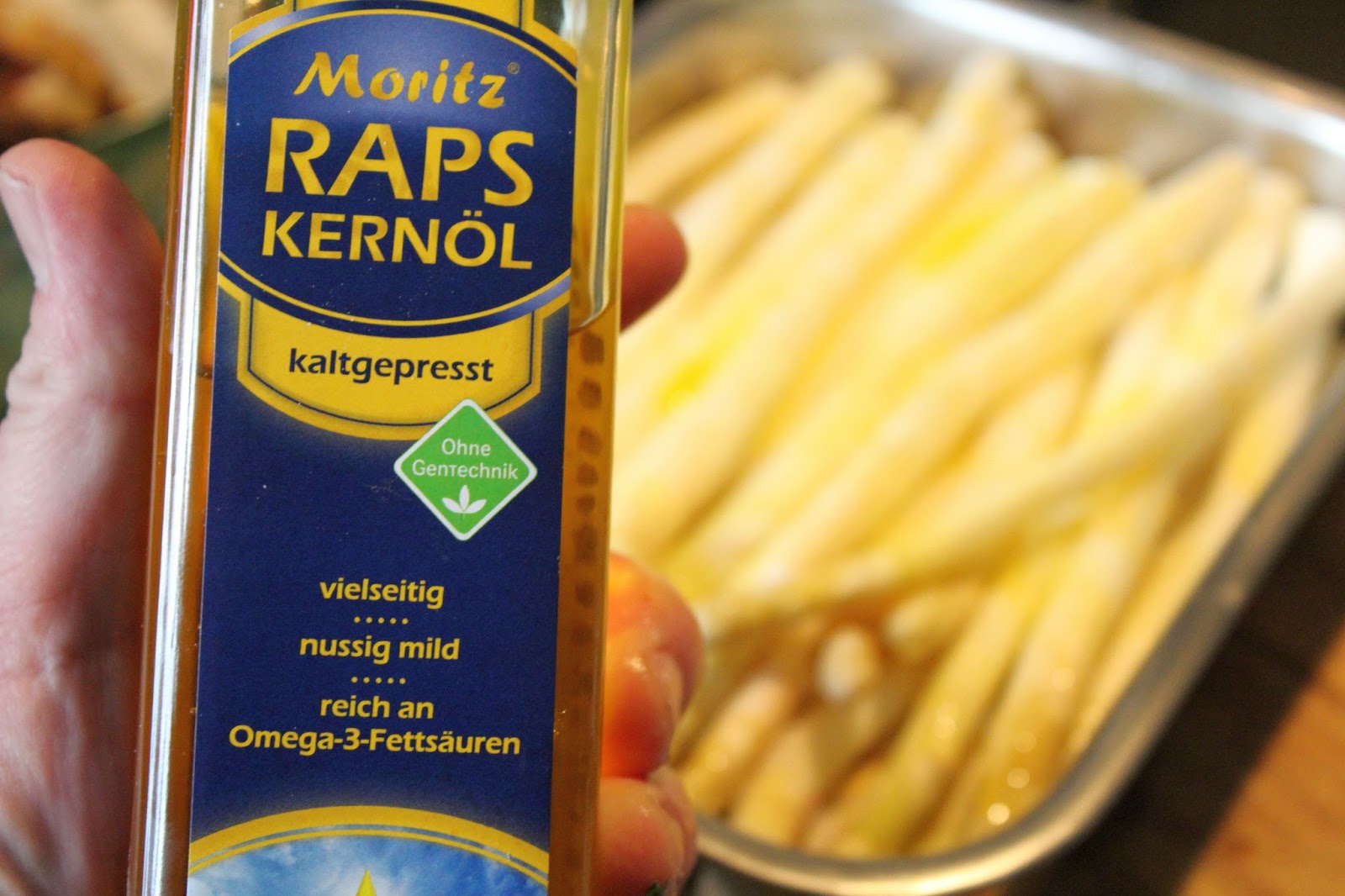 Als Beilage gibt es Spargel, den ich halb im Ofen zubereite und auf den Rest in der Pfanne schwenke.