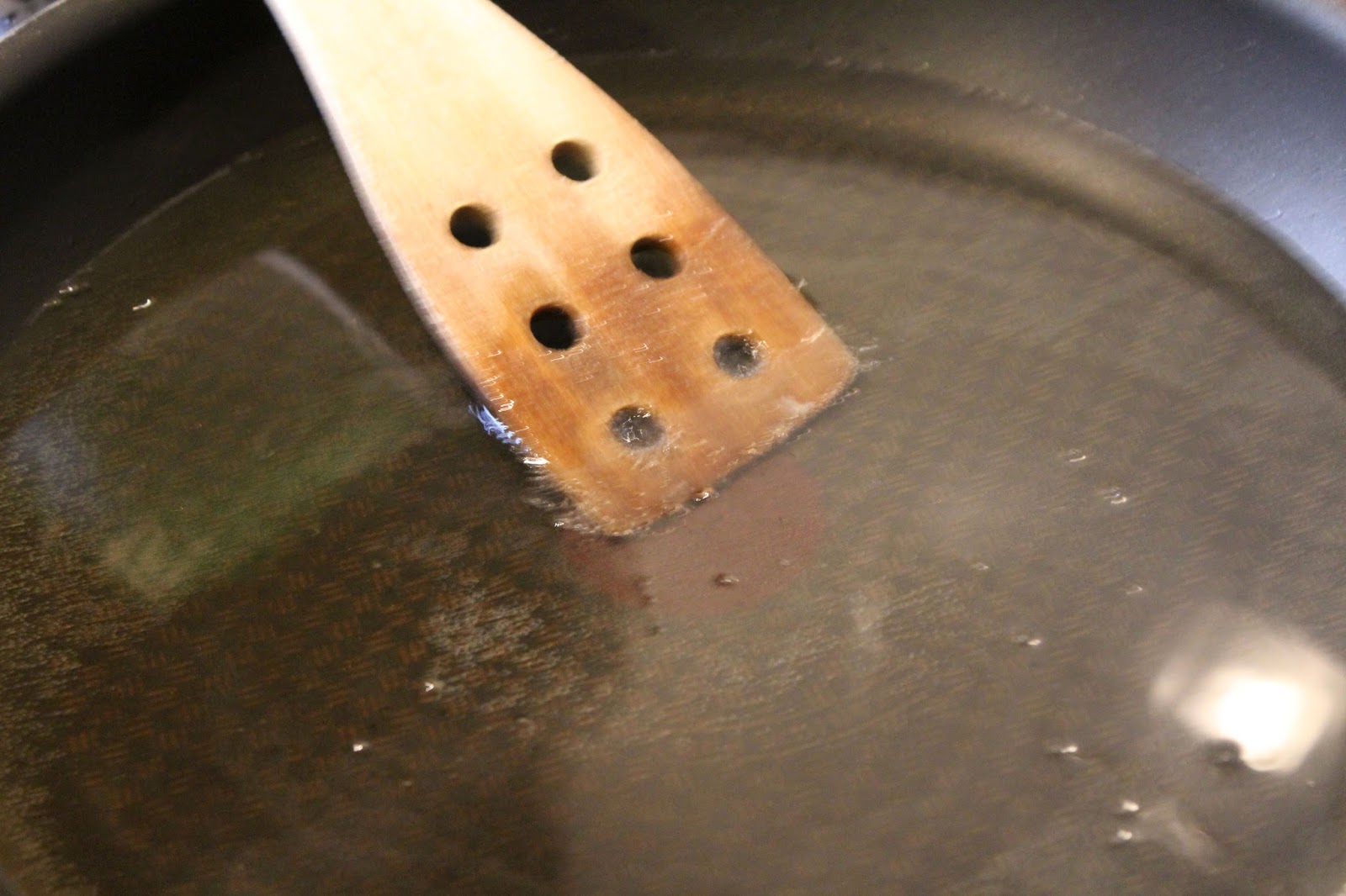 0,5 Liter Pflanzenöl in der Pfanne erhitzen, bis am Pfannenwender Blasen aufsteigen.