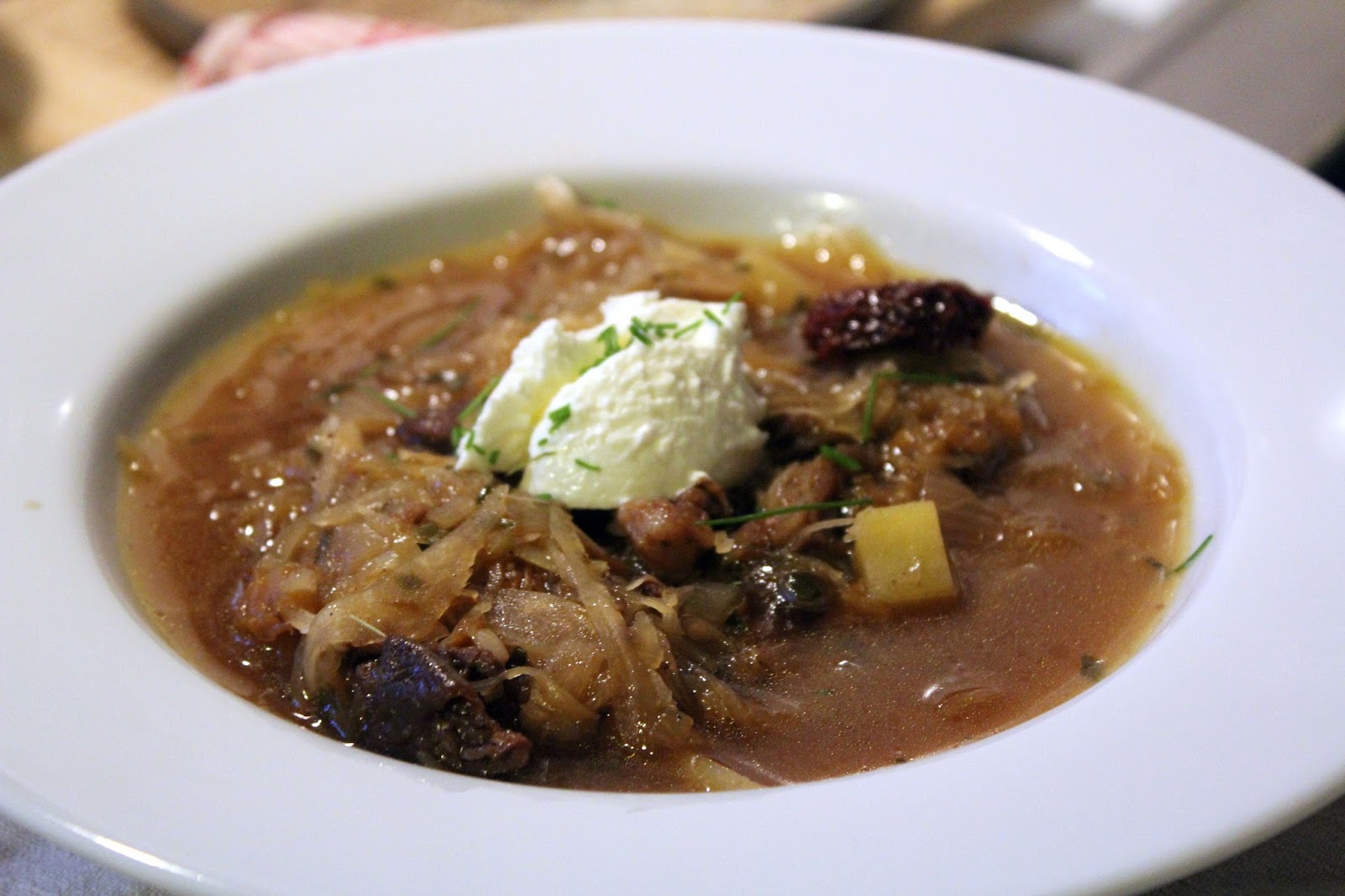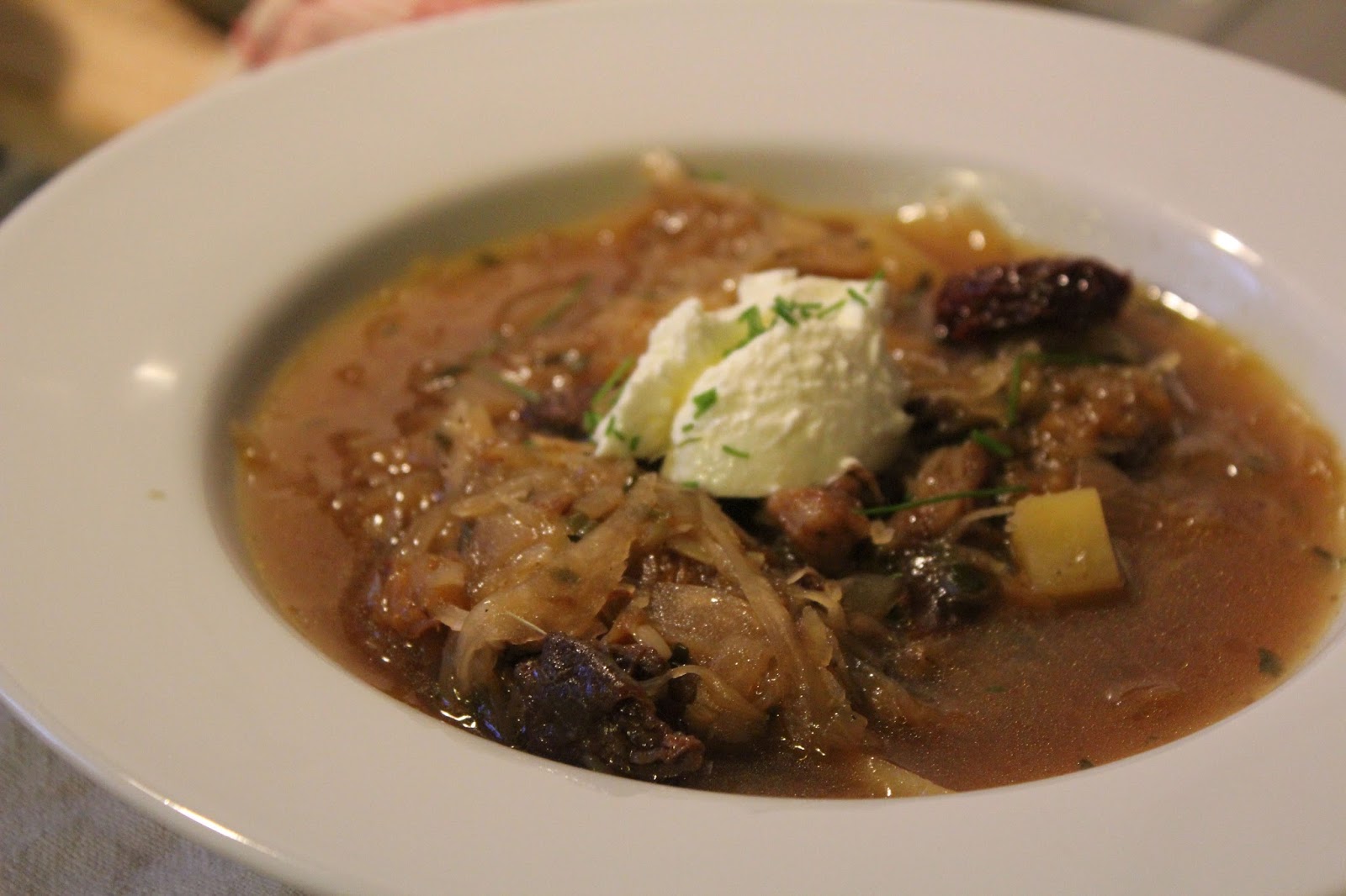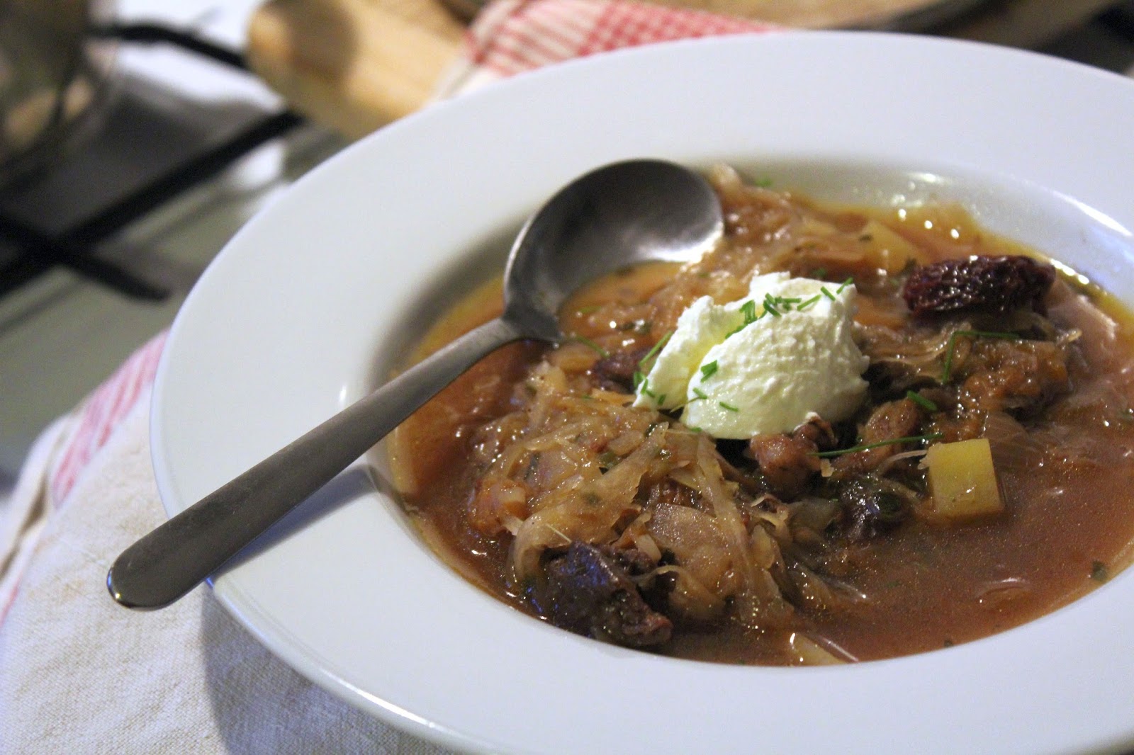 Ich finde die Suppe toll, weil da alles drin ist, was gut schmeckt. Deftiges Rindfleisch, gesundes Sauerkraut, süße kalifornische Pflaumen, die den eigentlichen Kick des Gerichts ausmachen, eine würzige Brühe. Die Suppe kann man auch in Gläsern einkochen, für Tage an denen man keine Lust zu kochen hat, oder gut gekühlt im Kühlschrank aufbewahren. Am nächsten Tag aufgewärmt entfaltet sie dann ihren ganzen Geschmack.