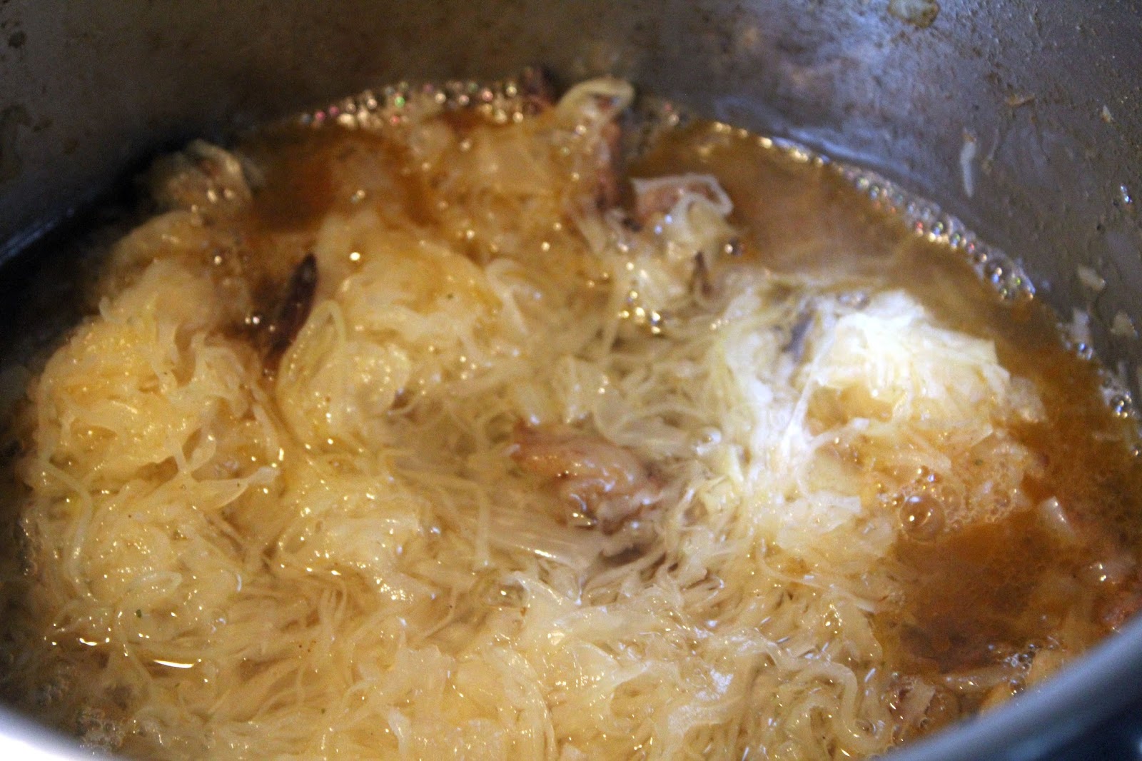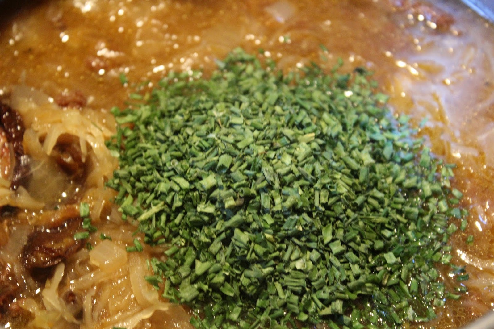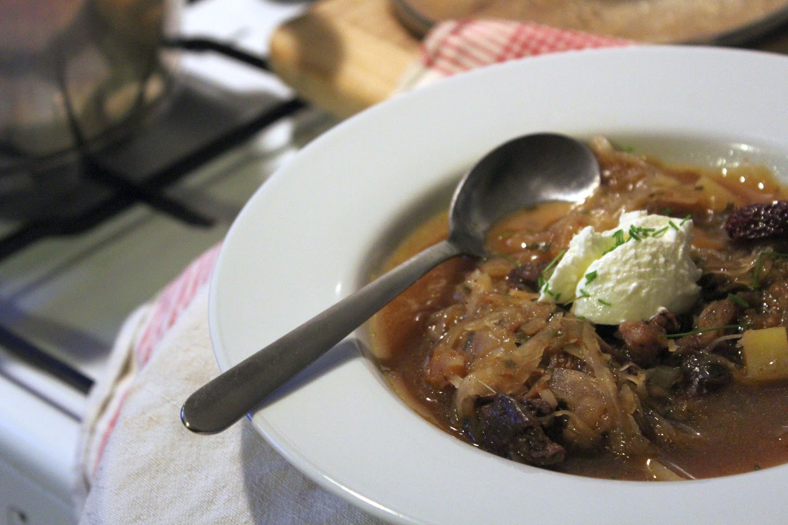 Ich finde die Suppe toll, weil da alles drin ist, was gut schmeckt. Deftiges Rindfleisch, gesundes Sauerkraut, süße kalifornische Pflaumen, die den eigentlichen Kick des Gerichts ausmachen, eine würzige Brühe. Die Suppe kann man auch in Gläsern einkochen, für Tage an denen man keine Lust zu kochen hat, oder gut gekühlt im Kühlschrank aufbewahren. Am nächsten Tag aufgewärmt entfaltet sie dann ihren ganzen Geschmack.