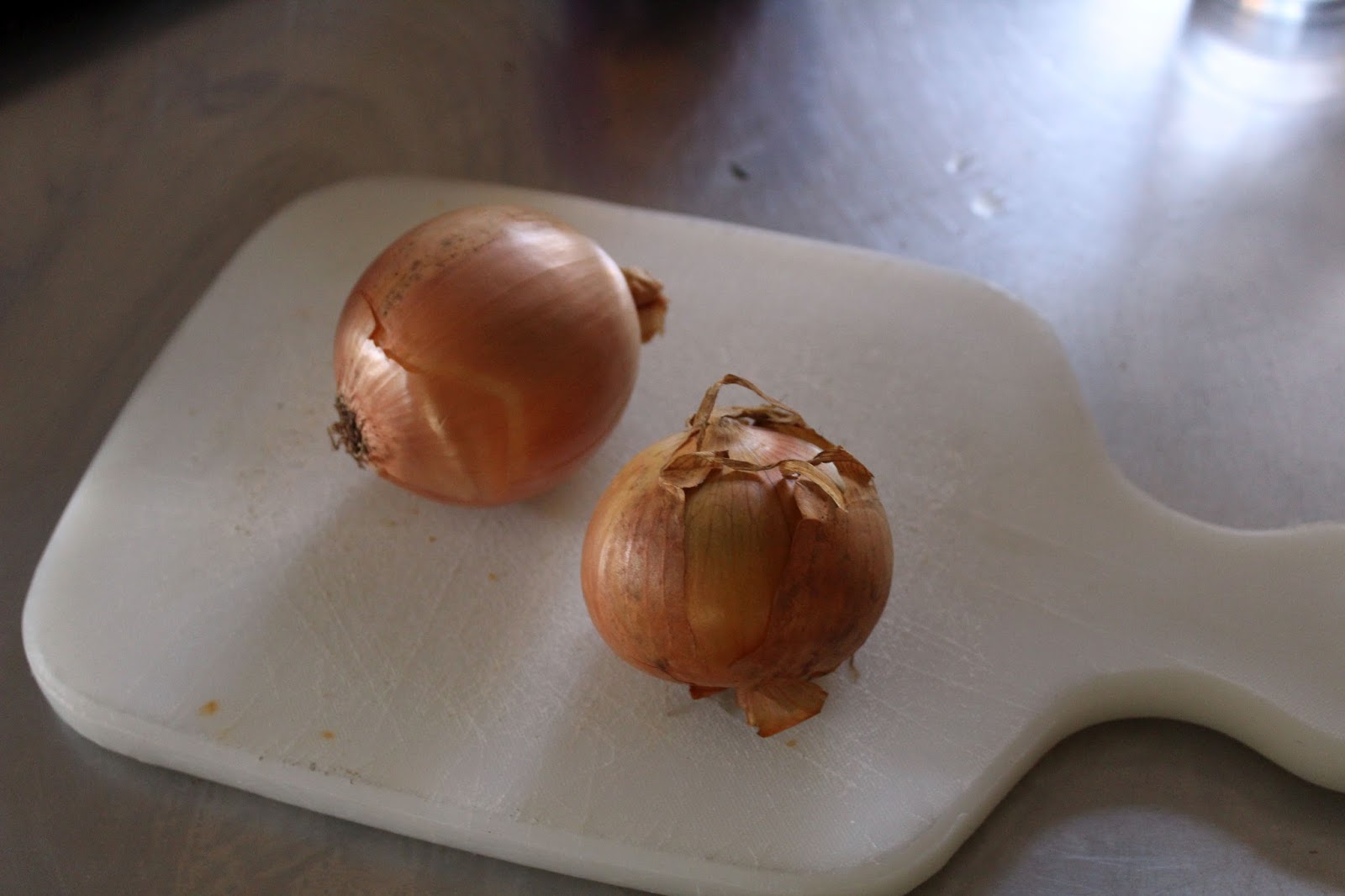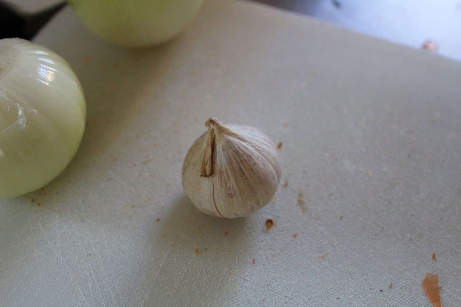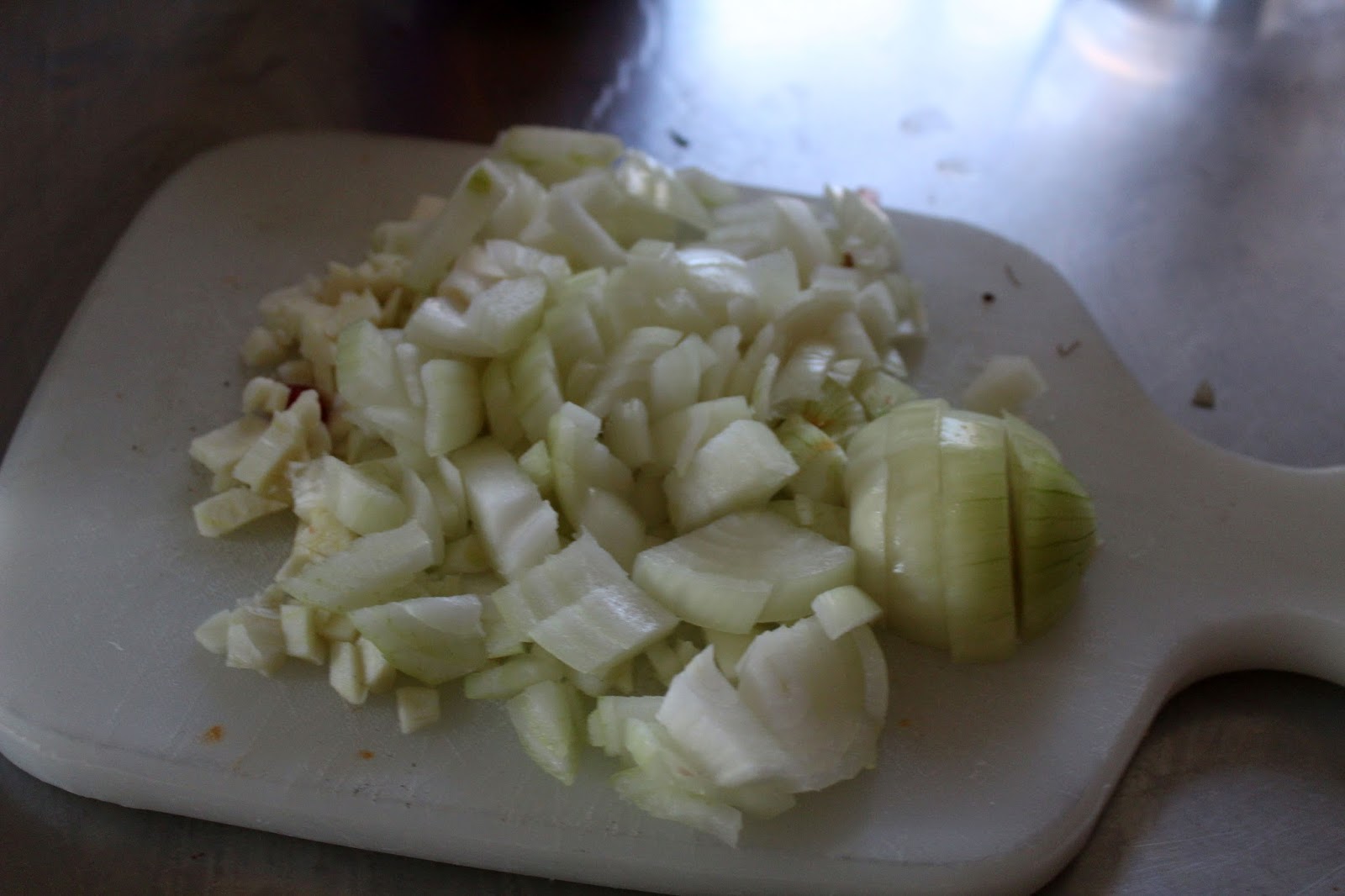 Die zerkleinerten Zwiebeln und Knoblauch stellen wir erstmal zur Seite.