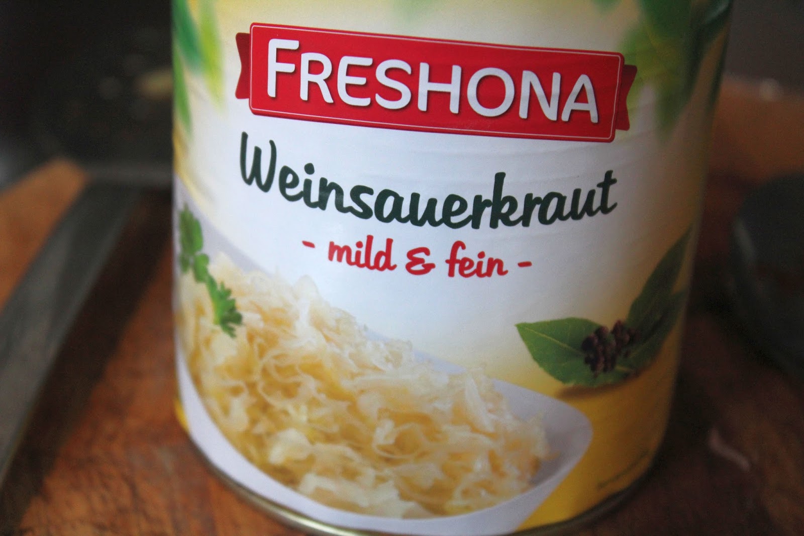 Nun eine große Dose Sauerkraut in den Topf geben, sowie zwei Esslöffel Zucker.