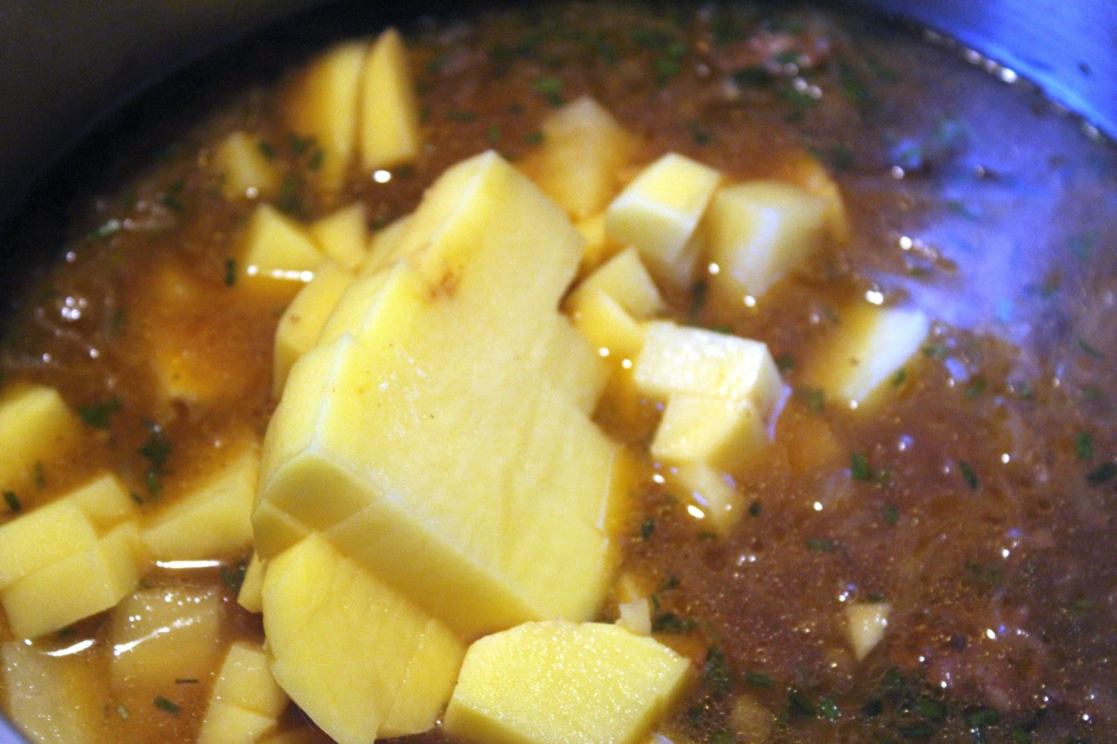 500 Gramm Karoffeln in kleine Würfel schneiden und noch einmal 20 Minuten bei der gleichen Temperatur weitersimmern lassen.