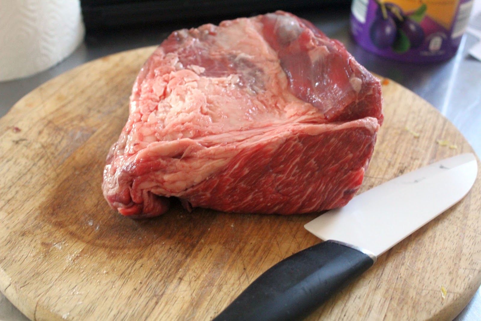 Das ist ein Zungenstück vom Rind. Das hat nichts mit einer Rinderzunge zu tun, sondern ist ein Stück des Rindernackens. Davon schneide ich 500 Gramm runter.