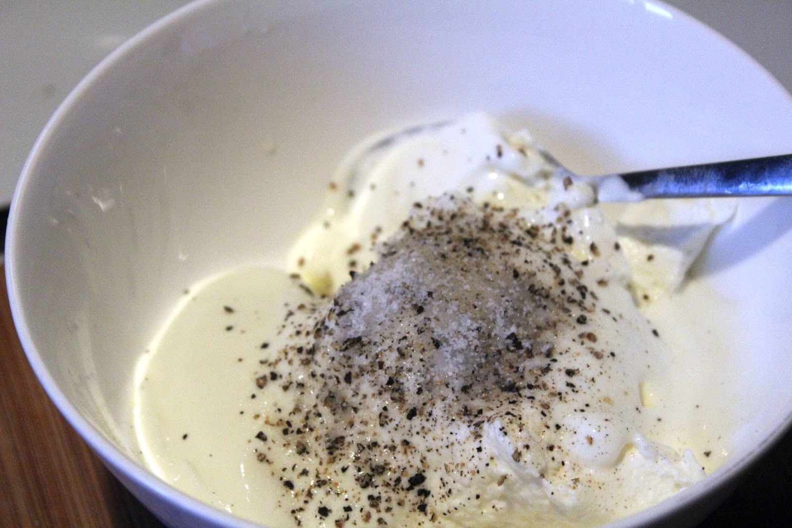 Quark-Joghurtddressing mehr oder minder malerisch auf dem Teller, oder einer der Komponenten verteilen.