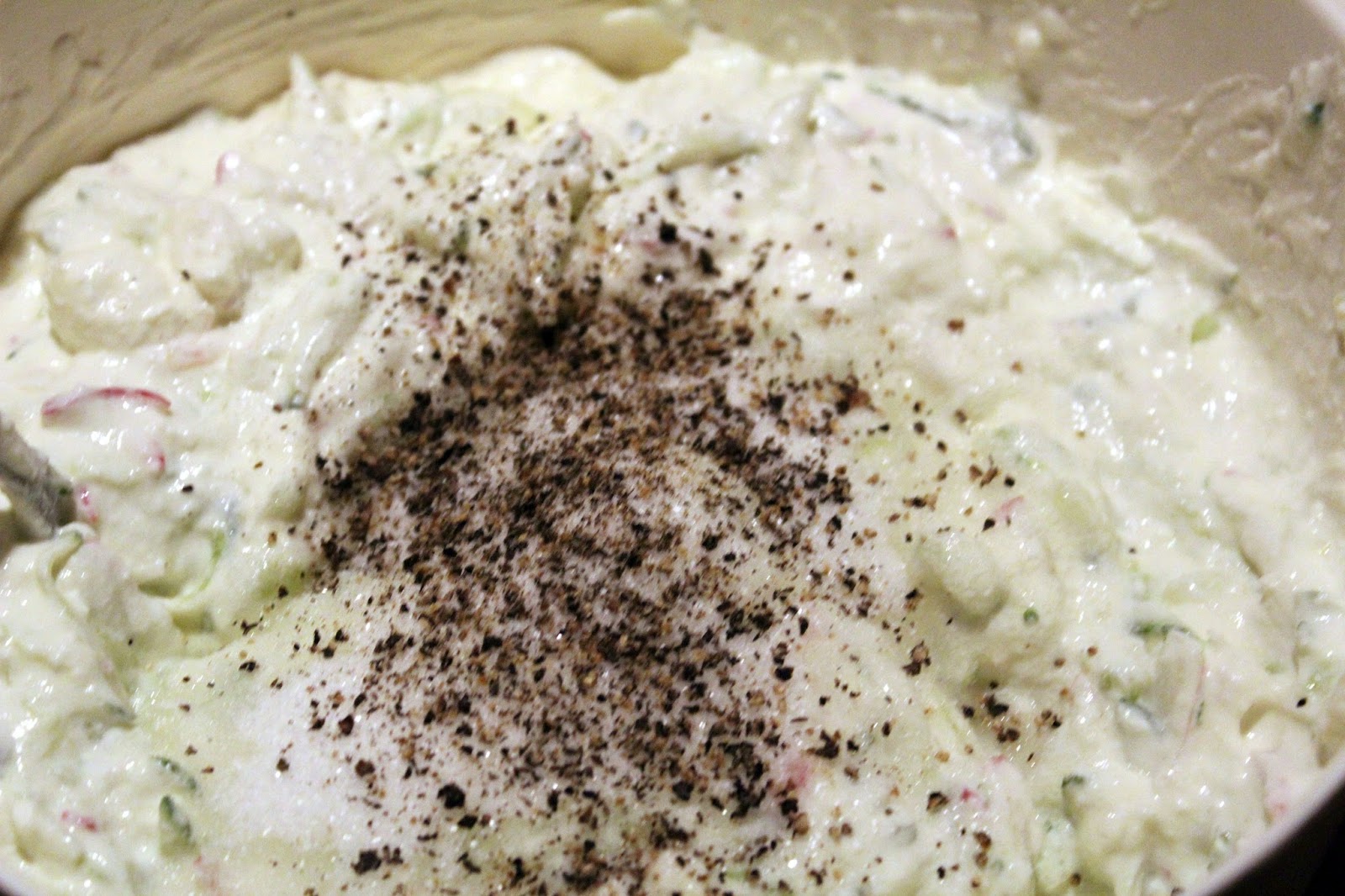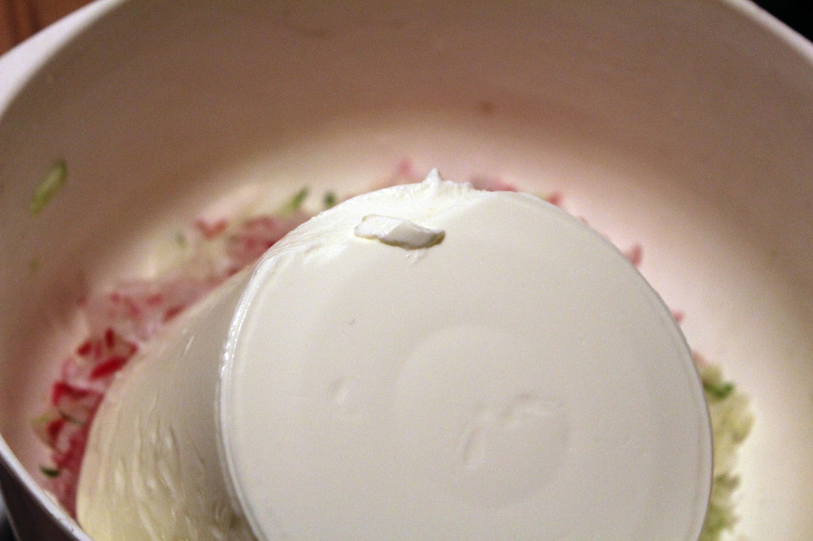Das ist ein Kilo türkischer Joghurt schnittfest mit 10 % Fett. Den gibt es auch mit 3,5 % Fettgehalt, aber dann schmeckt der eben auch genau so. Noch schlimmer sind ja Varianten mit noch weniger Fett, die haben dann nur noch den Charakter von gefärbtem Wasser. Meine Frau will jedenfalls immer die volle Dröhnung, aber die kann es sich ja auch leisten Schaut Euch mal die Füllhöhe an, das wird später noch interessant. Was ich an Gemüse in die Schüssel gegeben habe, habt Ihr auch gesehen, 1/2 Gurke, 1 Zwiebel, Radieschen, da ist also schon was in der Schüssel drin.