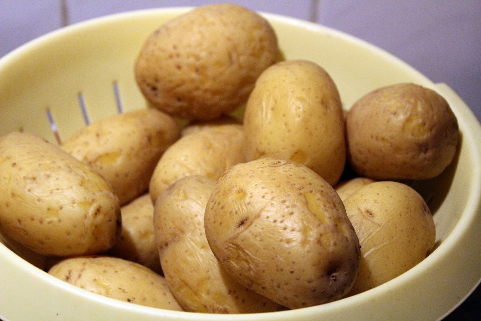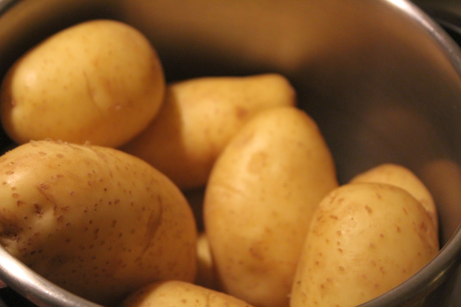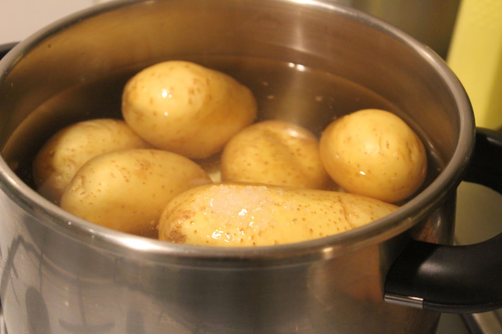 Je dicker die Kartoffel, desto länger dauert es, bis sie innen nicht mehr roh ist. Weil die Kartoffel aber nur vorgegart werden soll, damit sie auf dem Grill nicht mehr so lange braucht, werden die Kartoffeln im ersten Arbeitgang nur ungefähr bis dreiviertel durch zubereitet. Sonst werden die schnell zu weich und verlieren die Form, wenn man sie später aus dem Topf abkippt. Kartoffeln in einen Topf legen und so viel kaltes Wasser in den Topf geben, dass sie gerade so bedeckt sind. Damit die Kartoffeln nach irgendwas schmecken, habe ich zwei Esslöffel grobes Salz ins Wasser gegeben. Man kann natürlich auch ganz schnödes feines Salz verwenden. Dann wird das Wasser erhitzt und wenn es kocht, stelle ich die Uhr auf 20 Minuten, weil das sehr dicke Kartoffeln sind.
