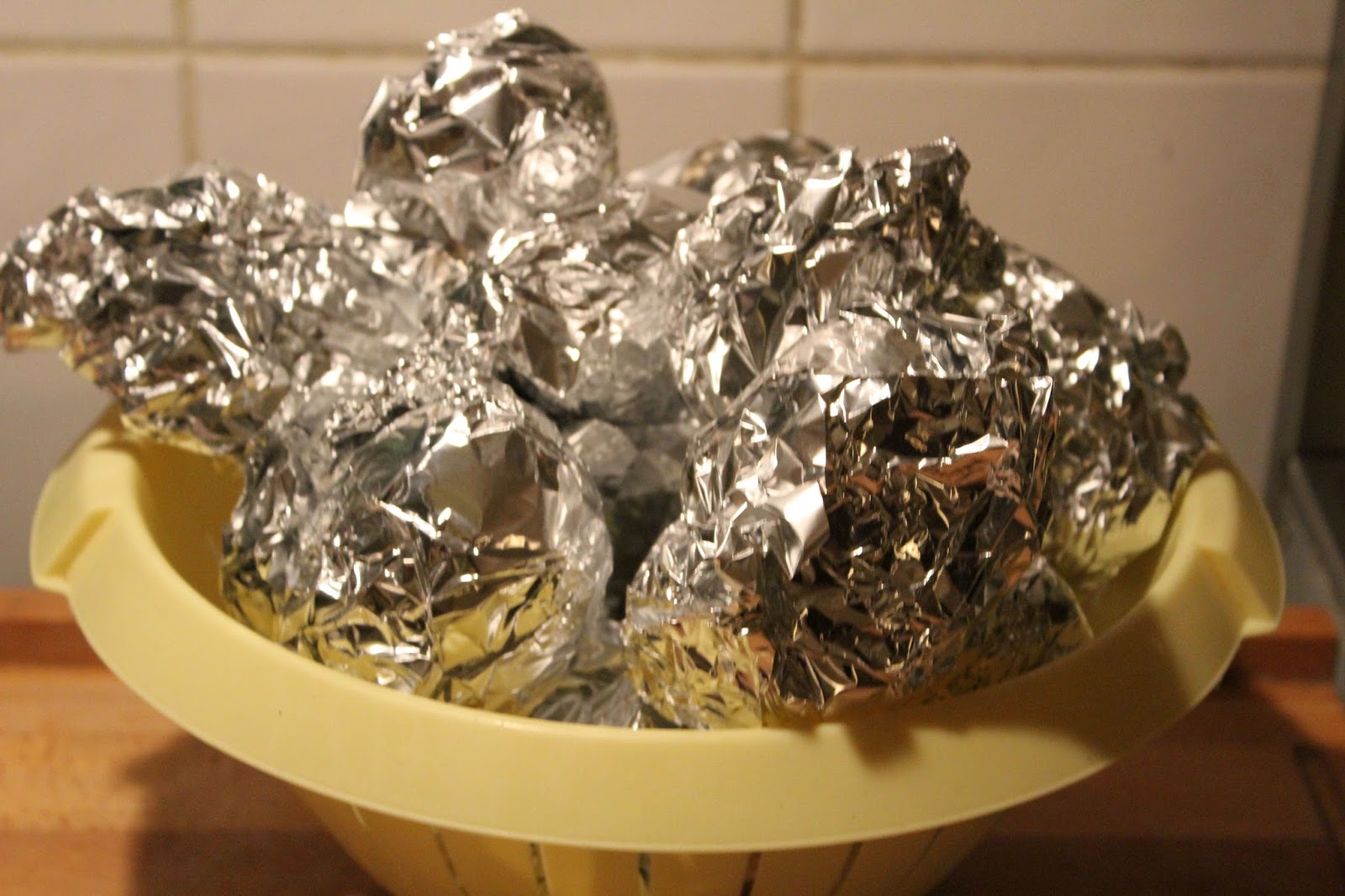 Wenn die Kartoffeln wieder so weit abgekühlt sind, dass man sie gut anfassen kann, werden sie Alufolie verpackt