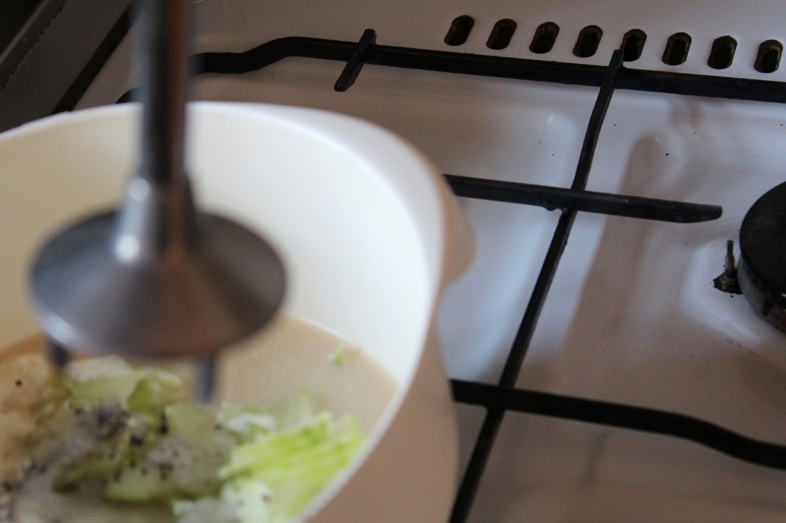 Jetzt wird die Gurkensuppe püriert. Ich nehme meinen Esge Zauberstab, Ihr nehmt Euren Pürierstab.
