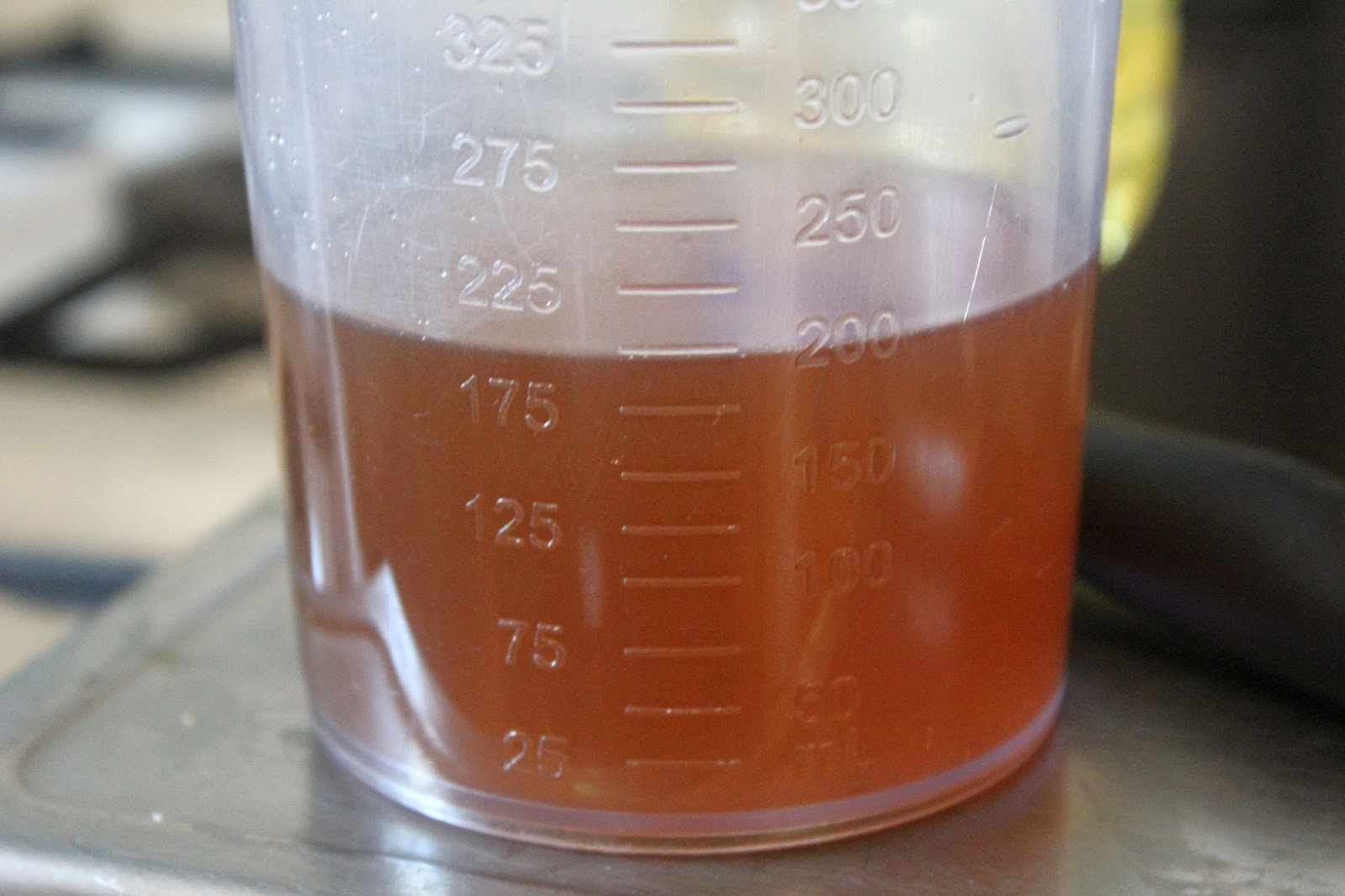 200 Milliliter Gemüsebrühe. Wie der Teufel das will, habe ich gerade einen 20 Liter Topf gekocht.