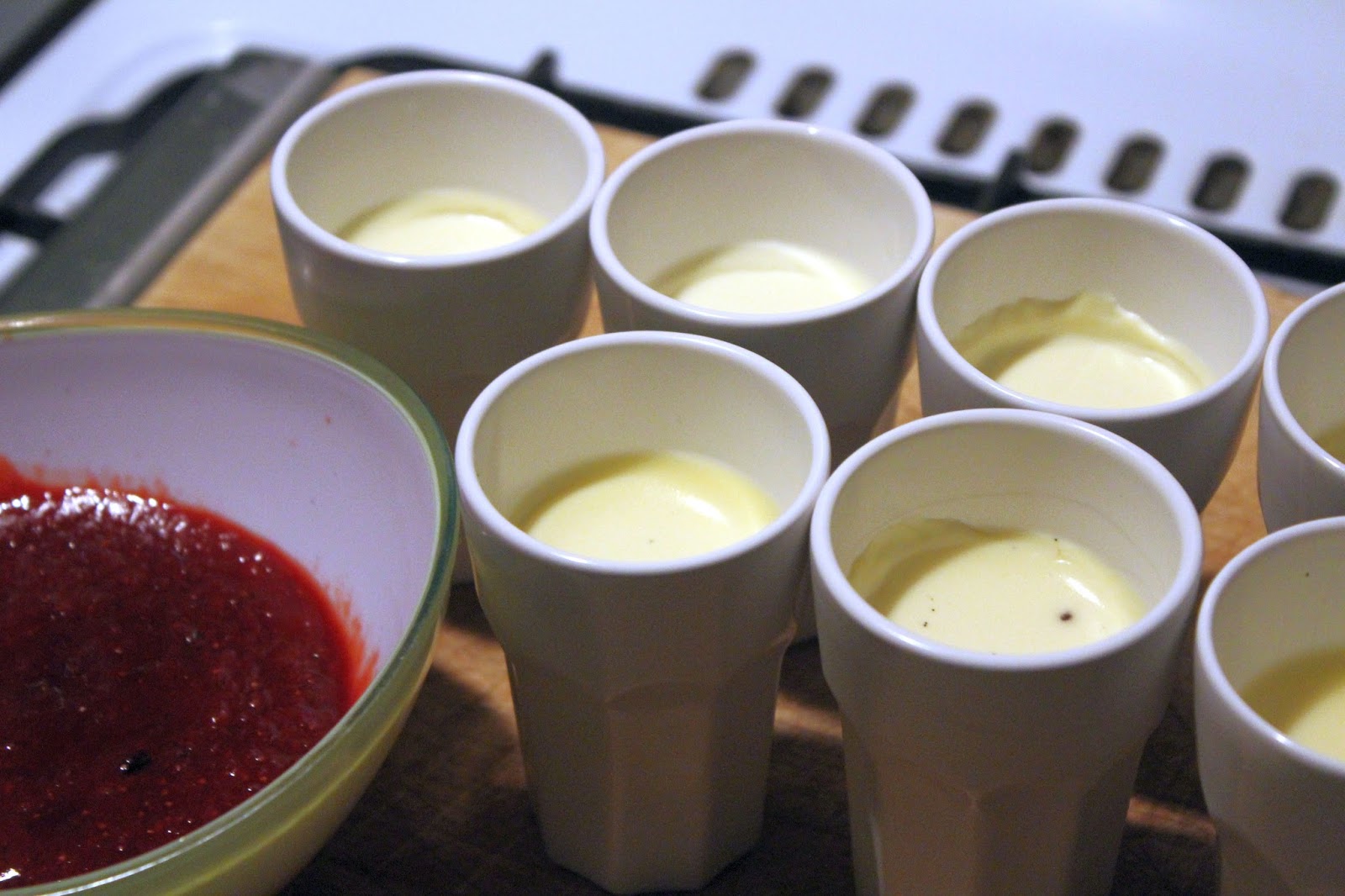 Man kann zum Servieren Schüsseln zum Stürzen verwenden, ich habe meine bewährten Ikea Espressotassen verwendet, aus denen die Panna cotta gelöffelt wird. Ich habe vier Kinder am Tisch, die zusammen jünger sind als unser Auto. Da brauche ich kleine Portionen und einfache Verpackung.