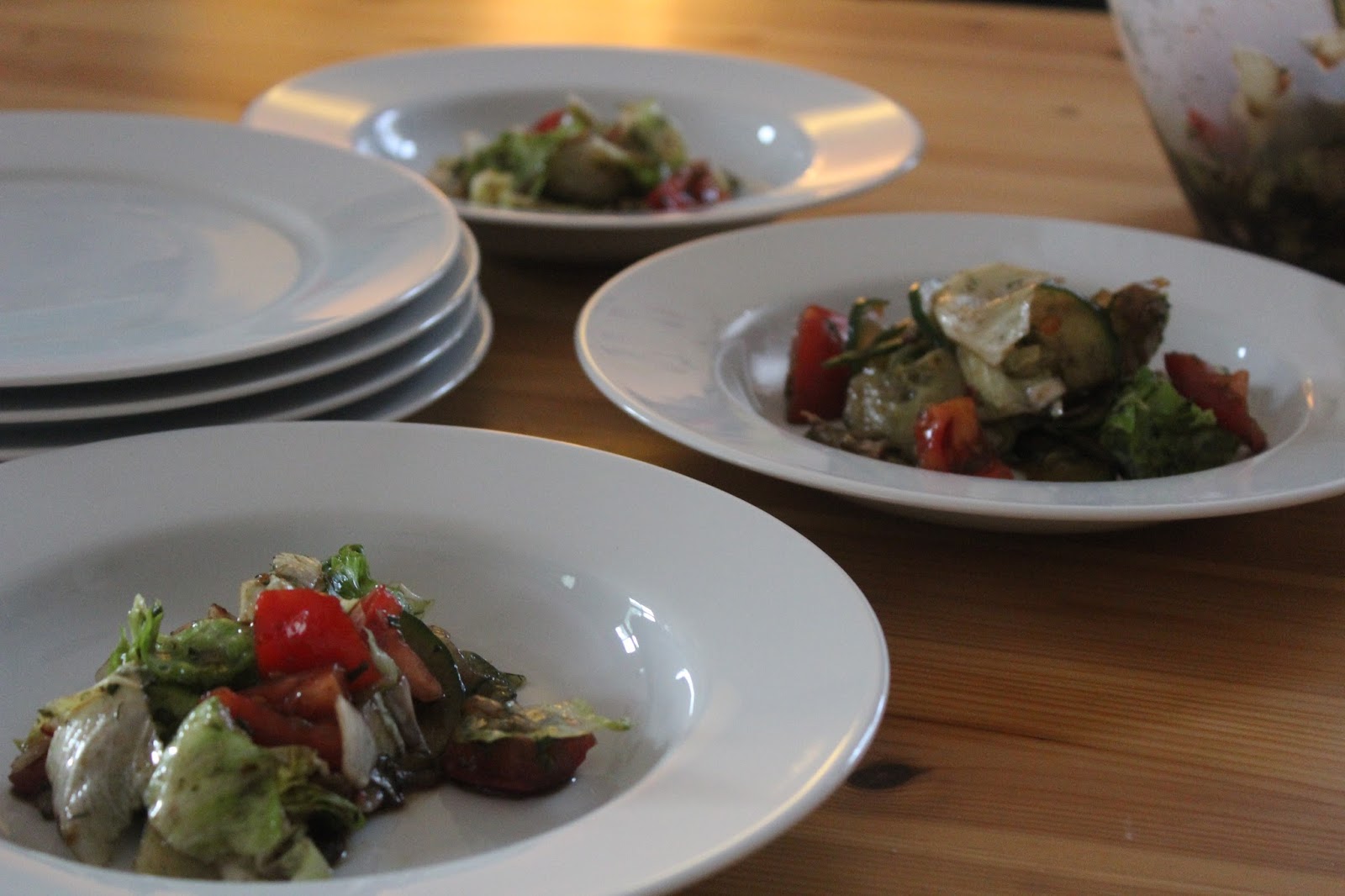 Salatzutaten gut miteinander vermischen und dann den Salat auf tiefen Tellern servieren.