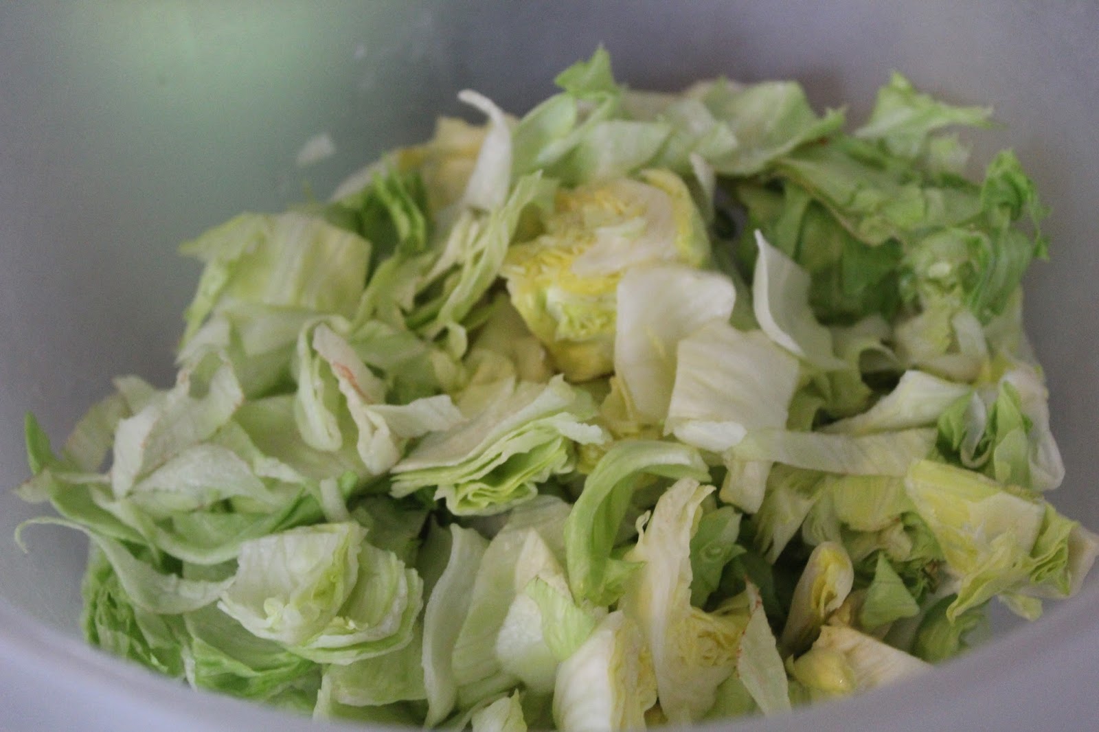 Eisbergsalat zerkleinern, Tomaten zerkleinern, Schittlauch und Dill drüber streuen. Noch nicht marinieren. Das machen wir knackfrisch direkt vor dem Servieren. .