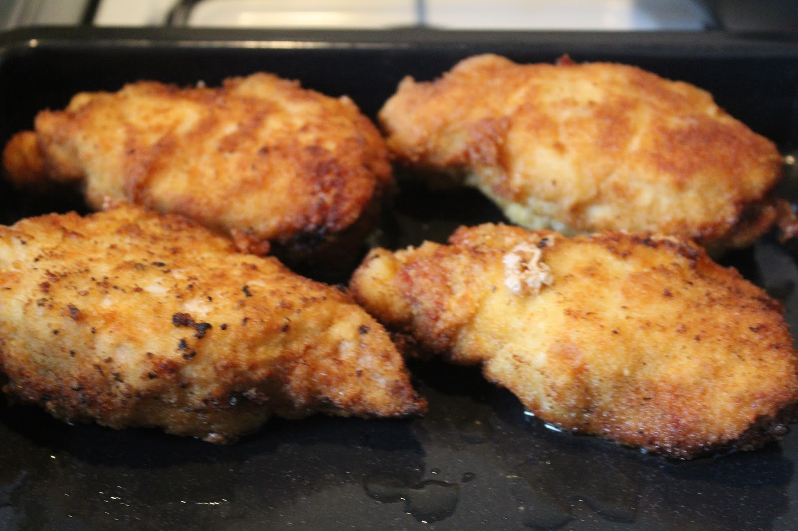 Die Schnitzel kommen nun auch aus dem Ofen und sind echt außen traumhaft knusprig und innen saftig.