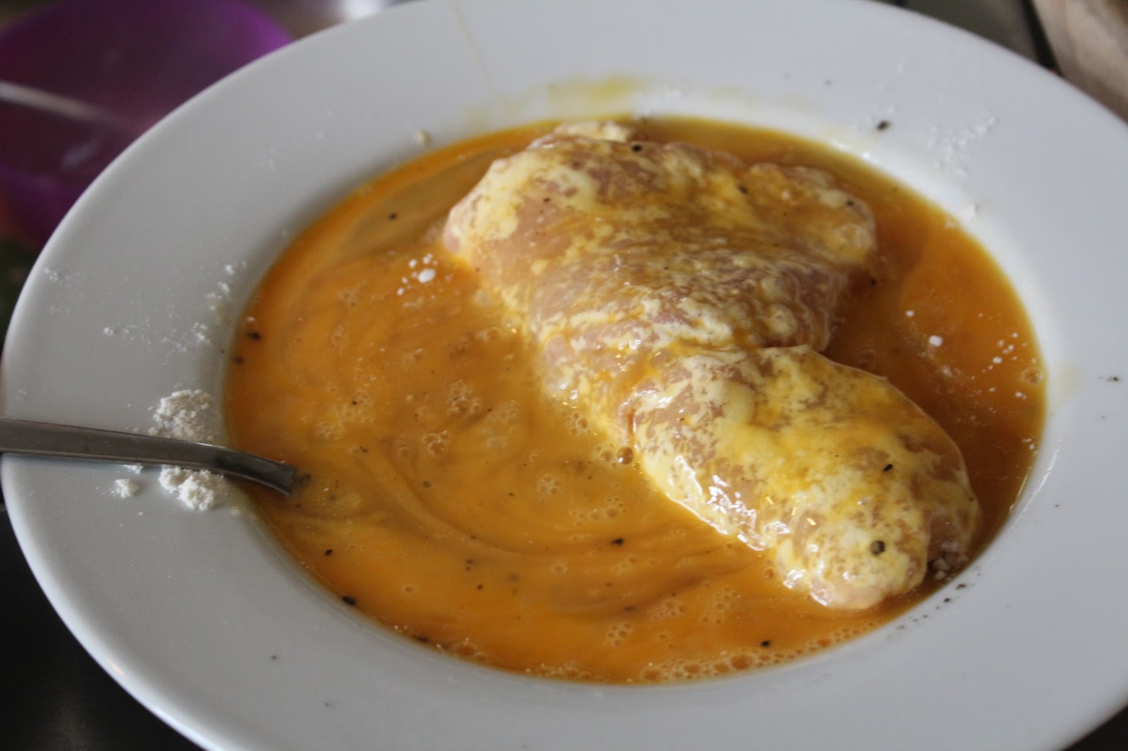Anschließend durch die Eimischung ziehen und darauf achten, dass überall Ei am Fleisch haften bleibt.
