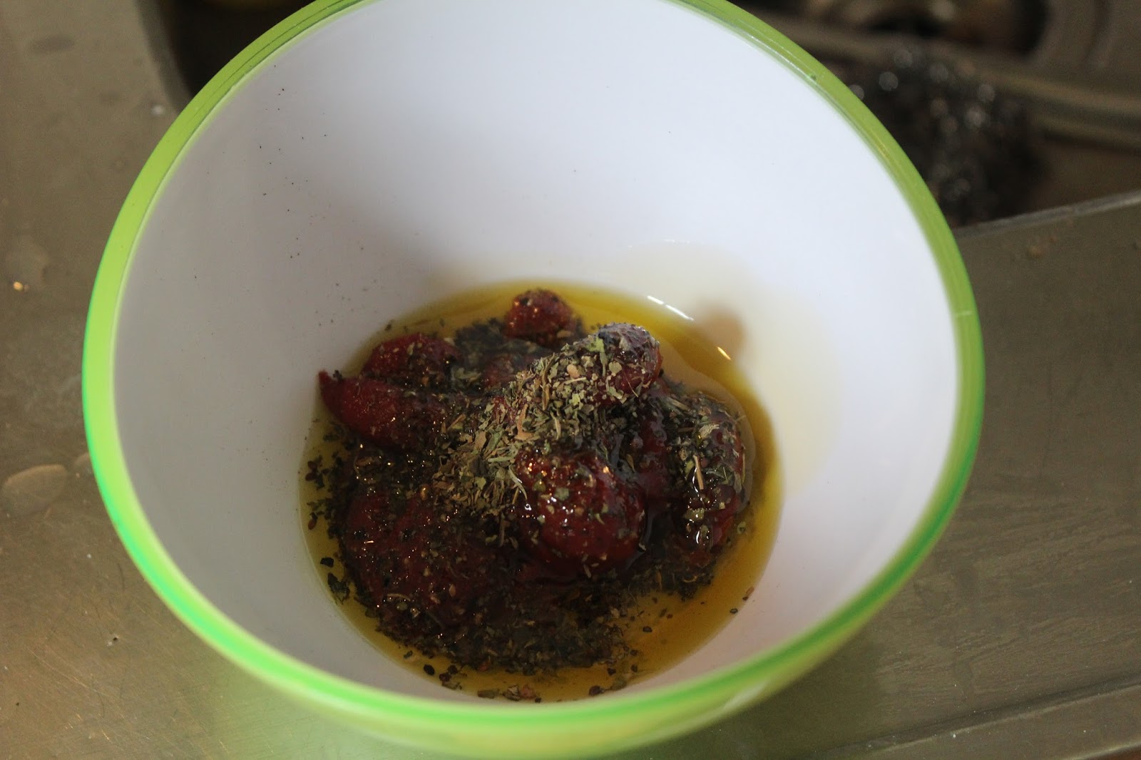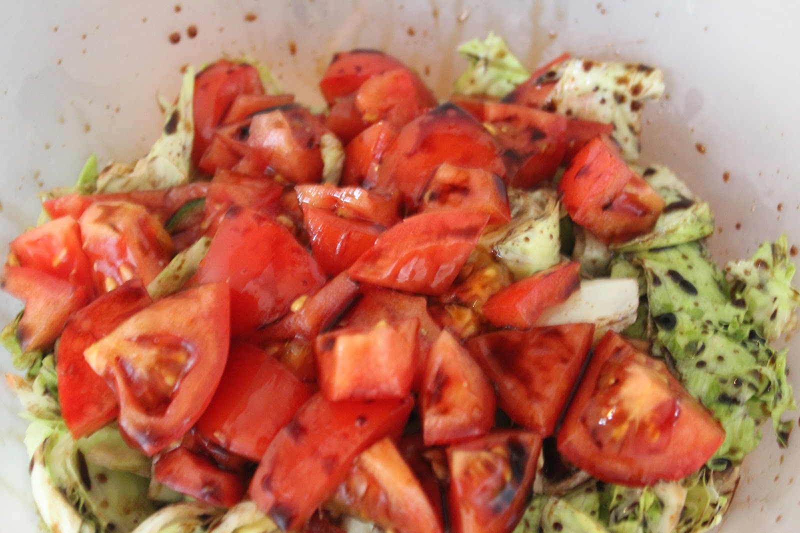 Die Zeit nutze ich, um den Salat fertig zu machen. Salz, Pfeffer, Zucker zum Würzen und Oliven und Balsamico für die Marinade verwenden. Zu den Capreseschnitzeln kann man gut Olivenöl nehmen. Das ist mir sonst oft zu dominant, hier ist das die richtige Wahl