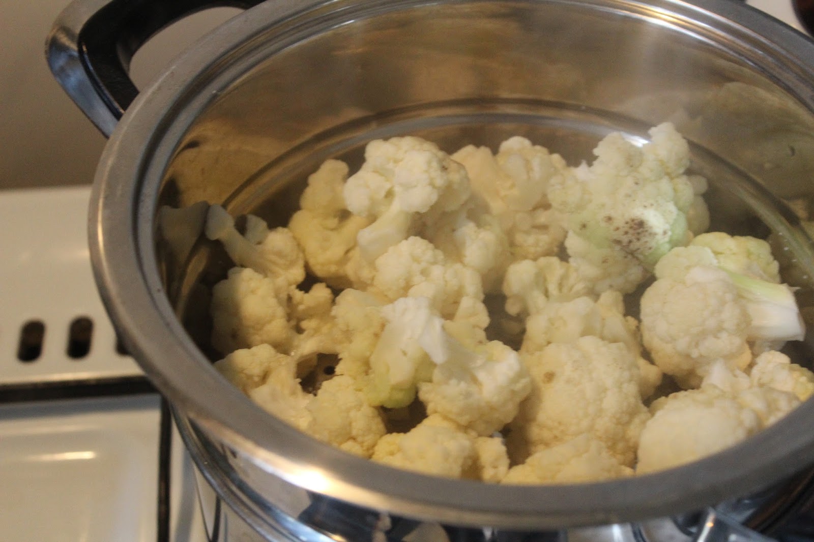 Blumenkohl zerkleinern und in einen Dampfgaraufsatz geben.
