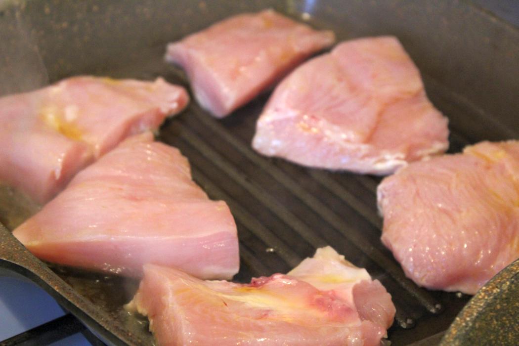 Die Putenbrust habe ich am Stück gekauft und selbst geschnitten. Das ist Ware von Metro, also nichts besonderes, was Herkunft und Aufzucht betrifft, aber schon beim Schneiden super zart und kein Vergleich zu dem, was man im Supermarkt bekommt. Das Fleisch pro Seite gute drei Minuten braten und zeitgleich wenn das Putenfleisch in die Pfanne kommt, den Ofen auf 100 Grad vorheizen. Nachdem ich gerade am Sonntag einen Putenstall besucht habe, weiß ich auch warum das Fleisch so zart ist. Das ist Hennenfleisch und wird nach 16 Wochen geschlachtet, bevor die Hennen geschlechtsreif werden. Putenhähne werden nach 20 Wochen geschlachtet und haben festeres Fleisch.