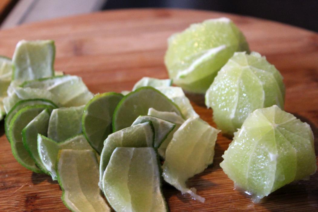 Drei Limetten mit einem scharfen Messer die Schale abschneiden, so als wenn man Orangenfilets machen wollte.